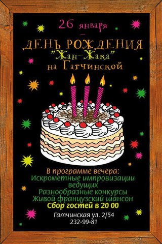26 января отмечает день рождения первый петербургский “Жан-Жак”. Французское кафе на Гатчинской улице открылось в 2006 году - с тех пор “Жан-Жак” превратился в сеть успешных демократичных заведений с французским антуражем. В программе вечера - импровизации от ведущих, конкурсы и живое выступление музыкантов.