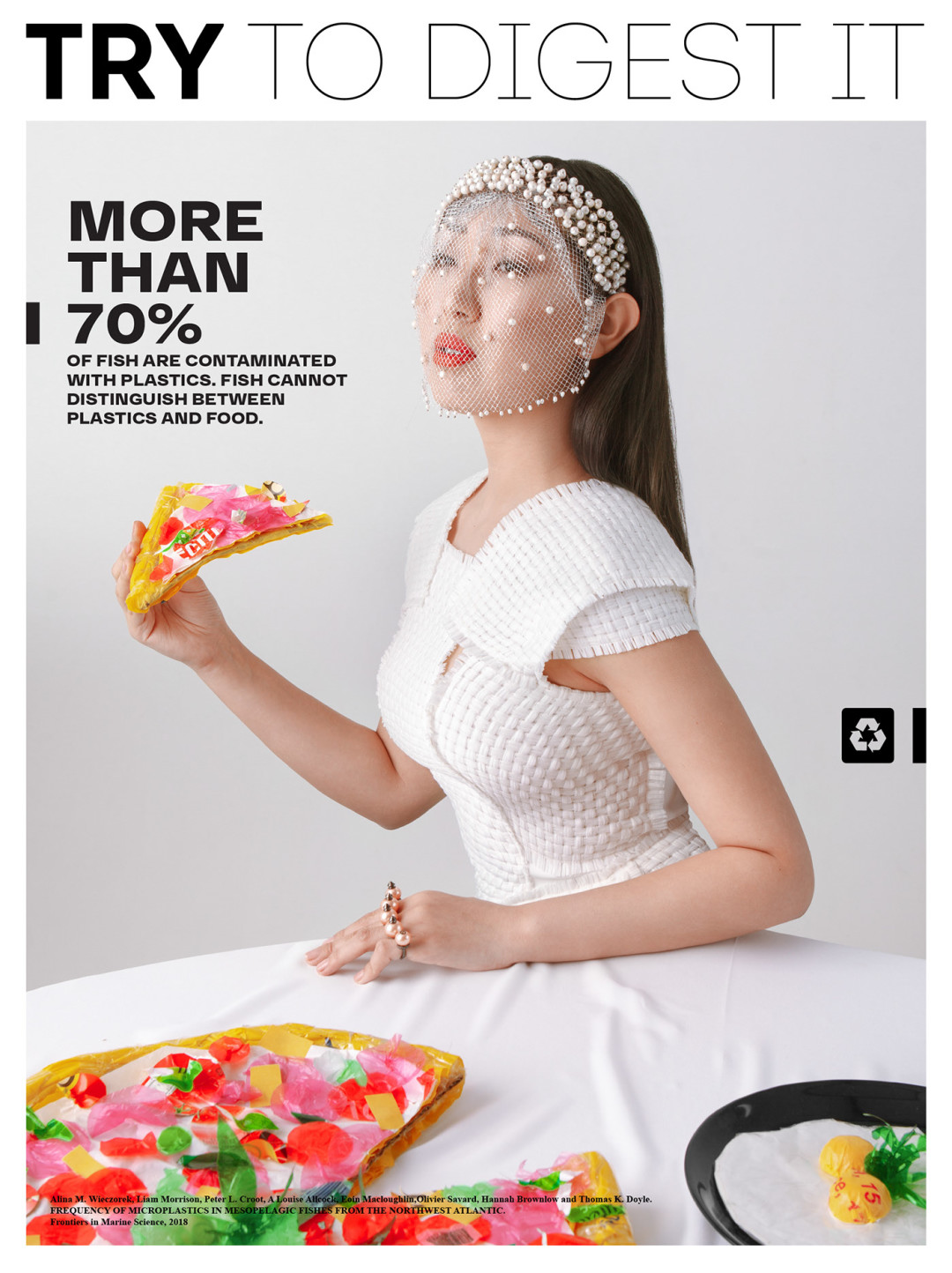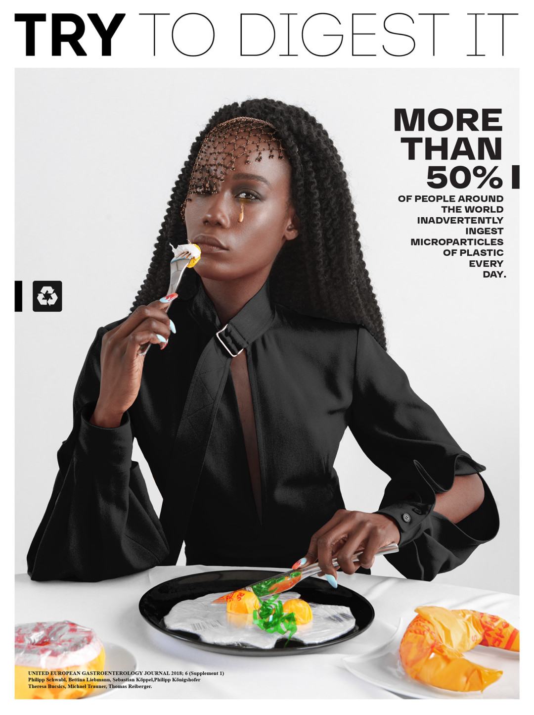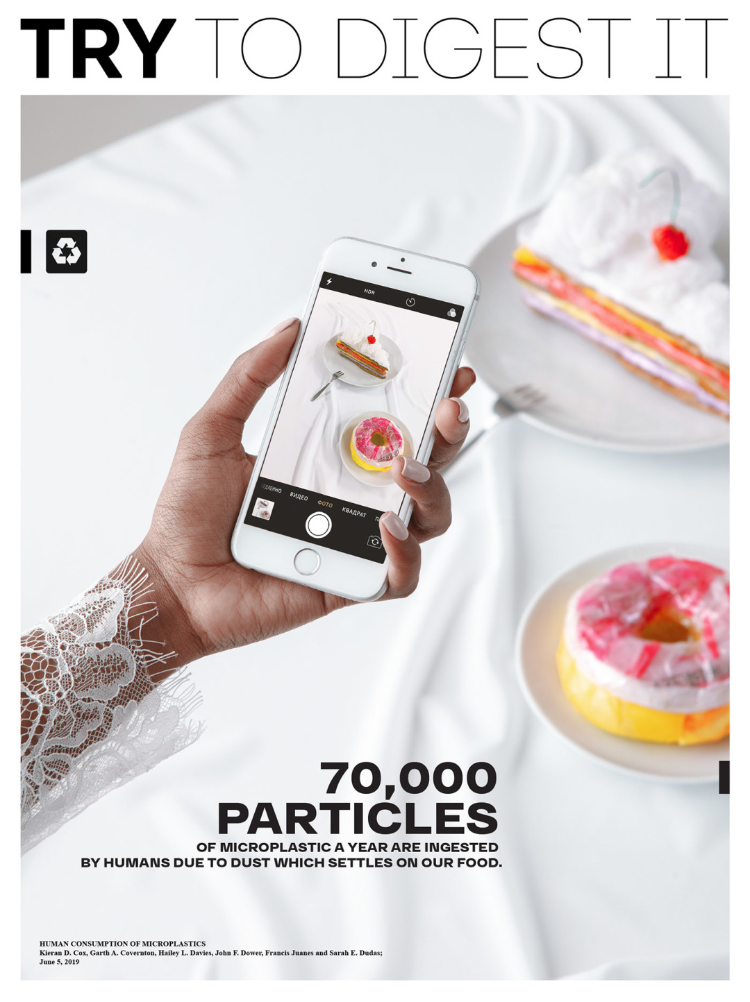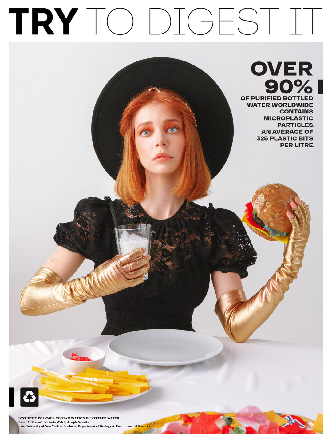 Нижегородская студия 100%ART, которая специализируется на каталожных, рекламных и персональных съемках, опубликовала фотопроект «Try to digest it» (в русскоязычной версии — «Попробуй это переварить» или «Реквием по еде»). Он рассказывает о вреде микропластика в необычной манере: ребята «приготовили» бургеры, роллы, пиццу, глазунью и картошку фри из разноцветных пакетов, но превратили гастрономическую съемку в модную путем ее стайлинга жемчужными ободками, золотыми перчатками, кружевными блузами и кожаными топами-бюстье.