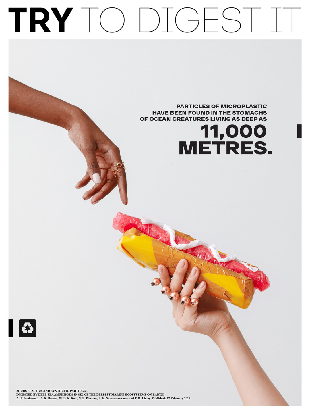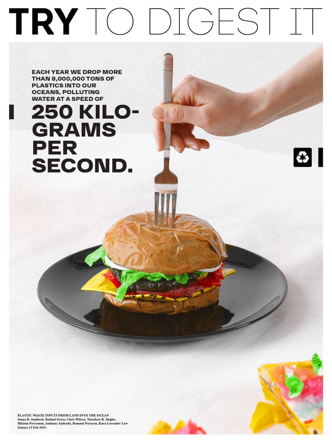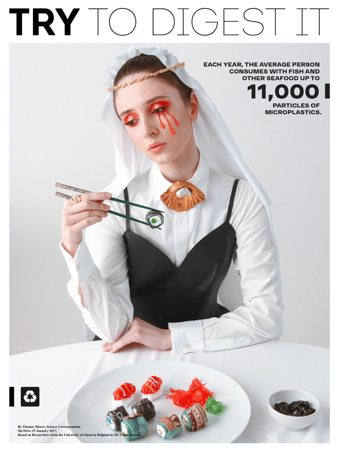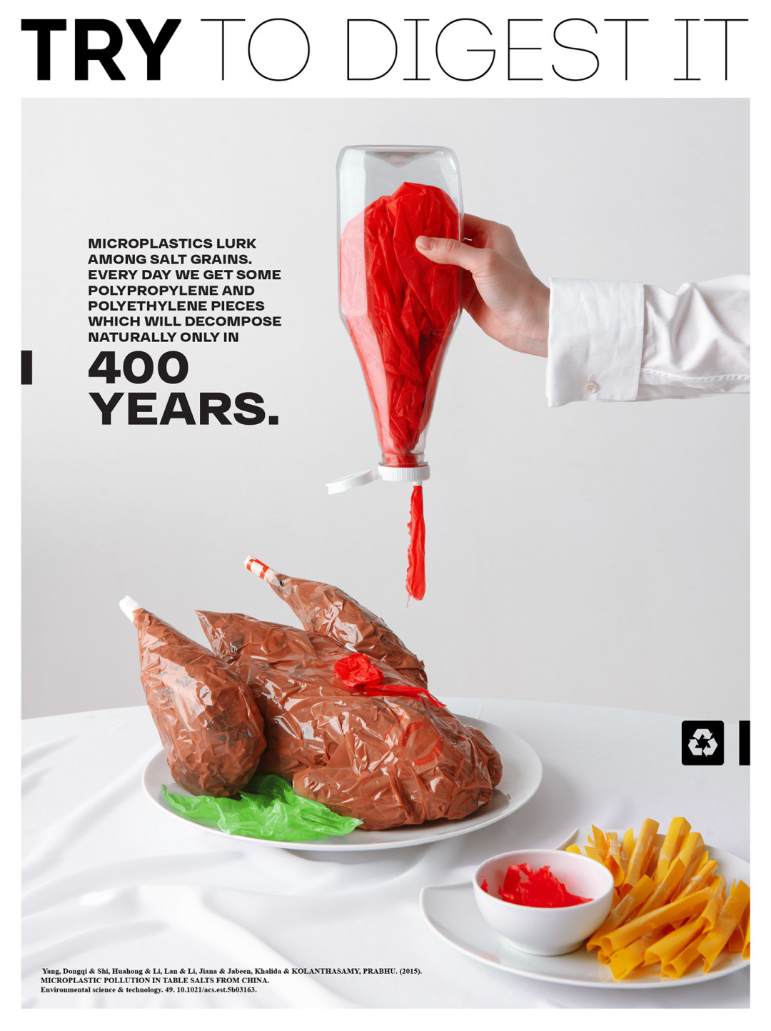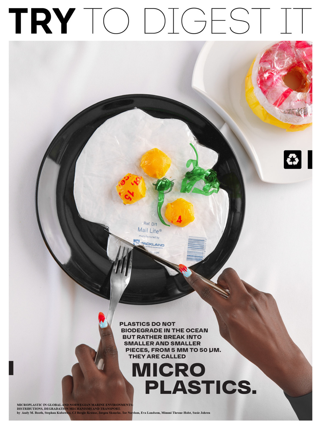 Нижегородская студия 100%ART, которая специализируется на каталожных, рекламных и персональных съемках, опубликовала фотопроект «Try to digest it» (в русскоязычной версии — «Попробуй это переварить» или «Реквием по еде»). Он рассказывает о вреде микропластика в необычной манере: ребята «приготовили» бургеры, роллы, пиццу, глазунью и картошку фри из разноцветных пакетов, но превратили гастрономическую съемку в модную путем ее стайлинга жемчужными ободками, золотыми перчатками, кружевными блузами и кожаными топами-бюстье.