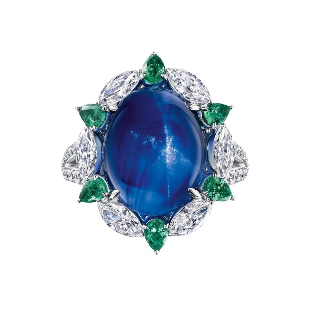 Сапфир весом 18,75 карата относится к роду звездчатых — но его лучистая сущность проявляется только в гладкой огранке «кабошон». Ювелиры петербургского ателье это учли. А еще (в бессознательных мечтах о паннакоте с черникой) поместили космический круглый камень в зеленое цветоложе из 0,7 карата изумрудных «груш» и 2,19 карата бриллиантового околоцветника.