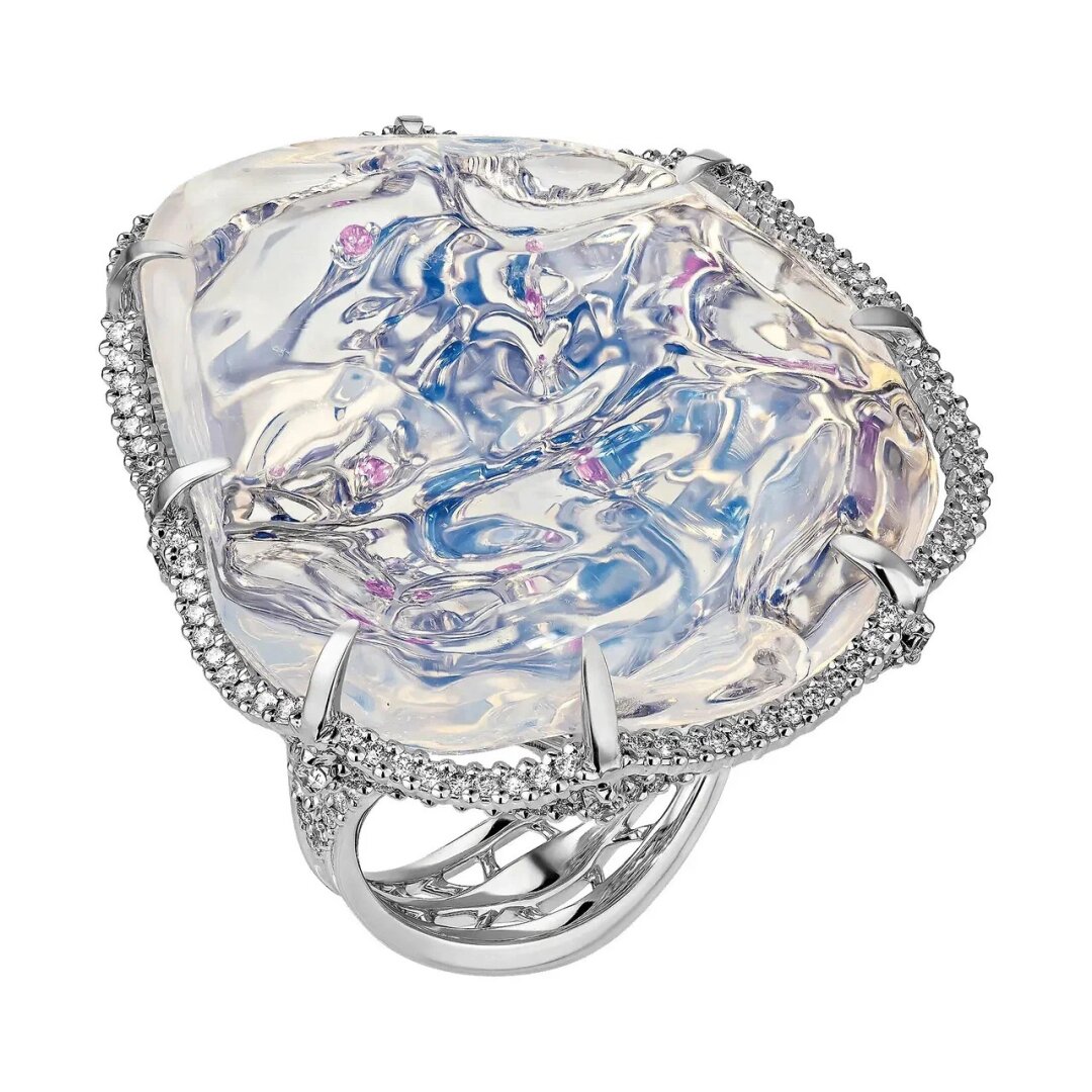 Из прозрачных волн мексиканского опала весом почти в 37 карат на кольце Maxim Demidov вот-вот появятся тридцать три богатыря — разноцветных сапфира.