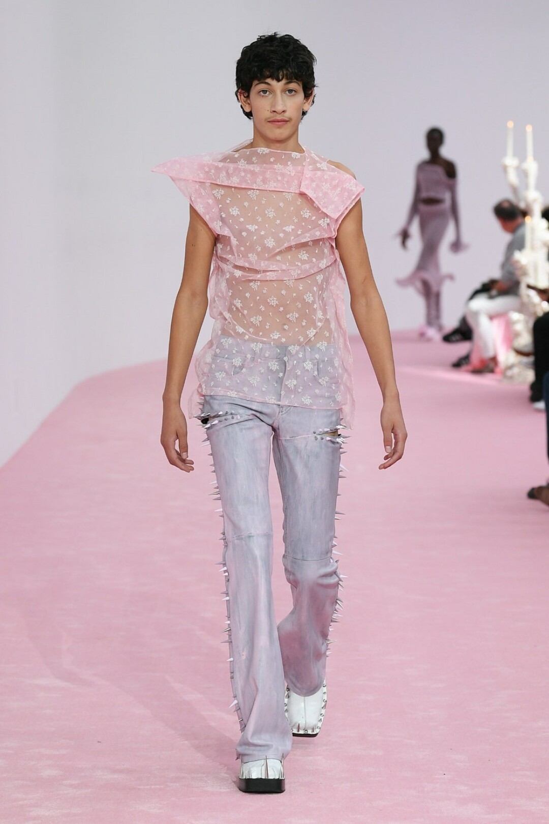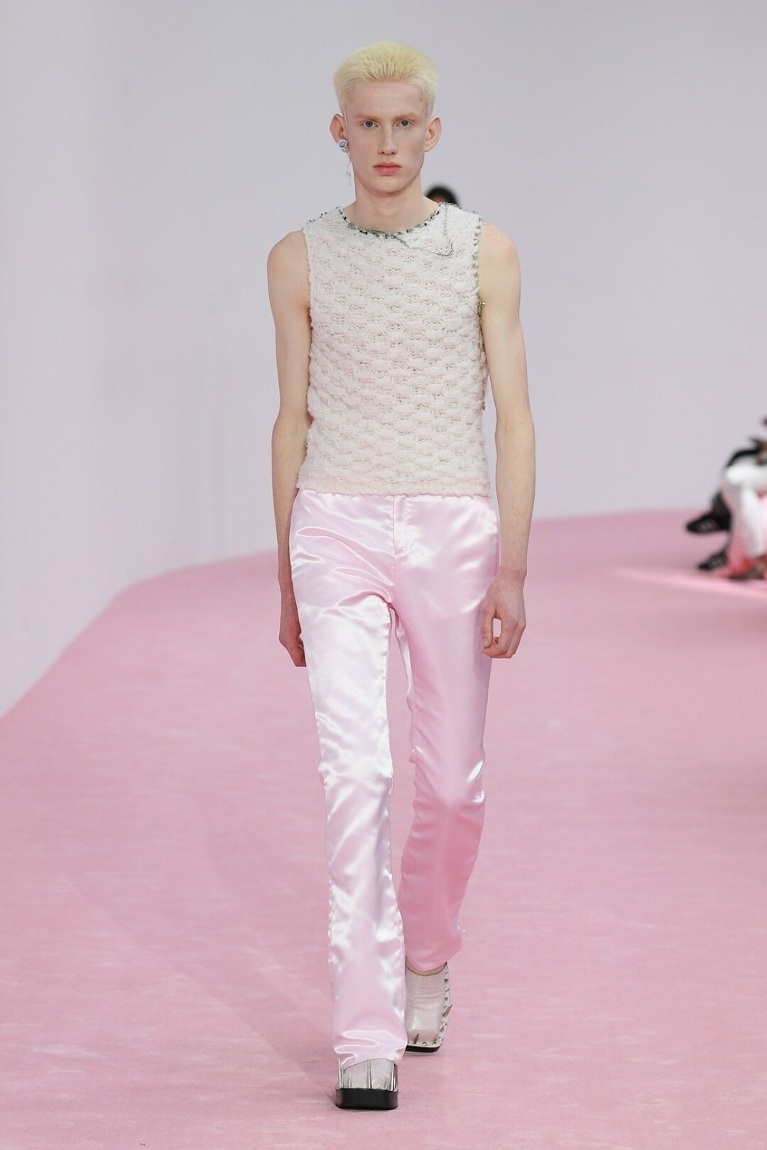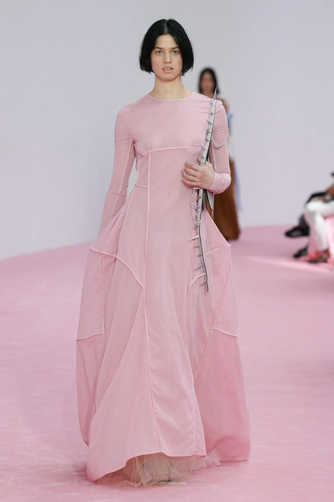 Все смешалось на розовом подиуме Acne Studios: банты, шелк, шипы и котята. В своей новой коллекции креативный директор бренда Джонни Йоханссон вдохновлялся свадебным китчем и всем, что с этим связано: навязчивой неуместной музыкой, подвыпившими гостями, нелепыми нарядами. Вспоминая свою собственную свадьбу дизайнер сожалел, что его наряд был слишком «безопасным». Так в коллекции появились шипы, прозрачные ткани и красное платье развязной подружки невесты.