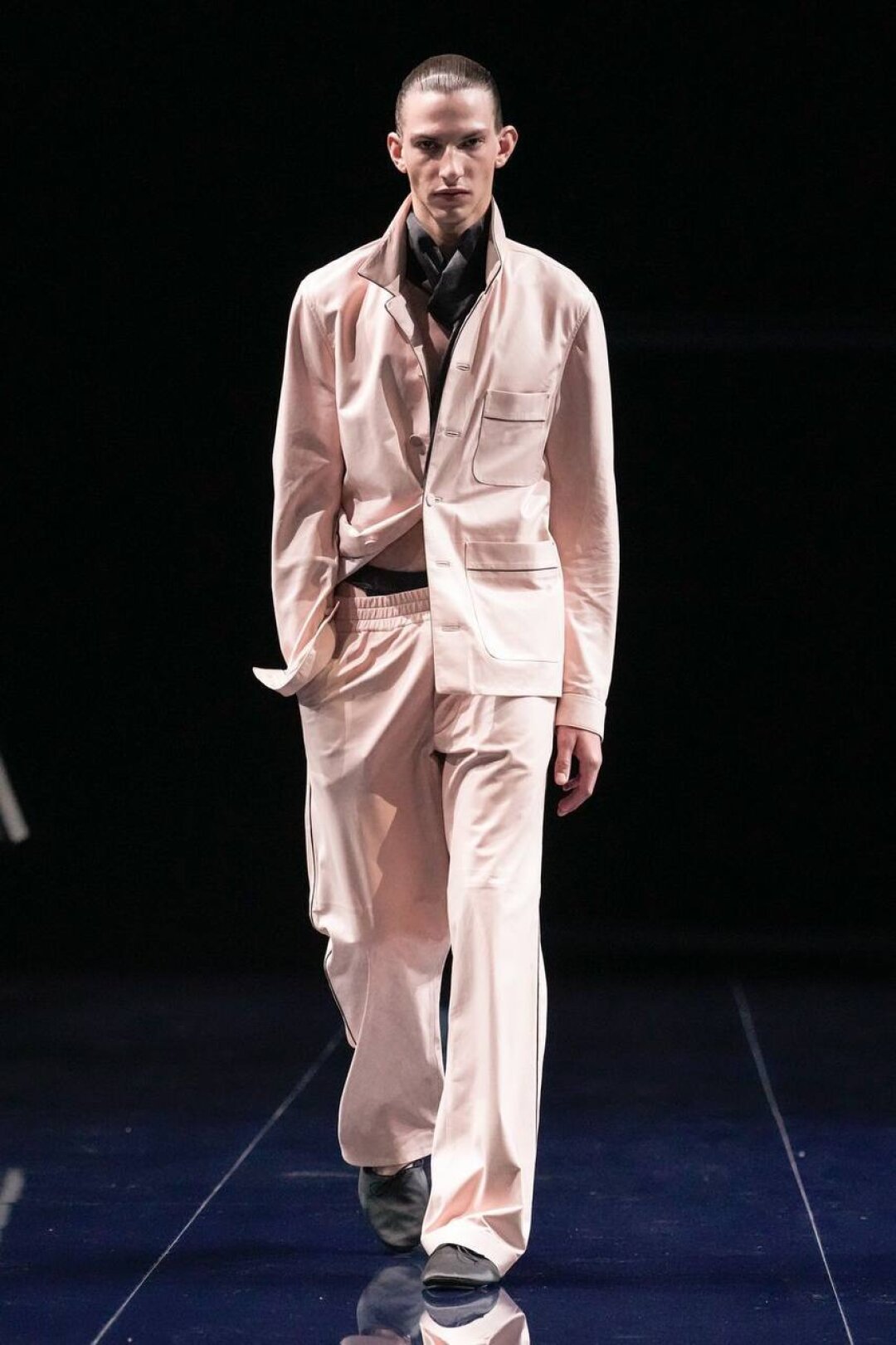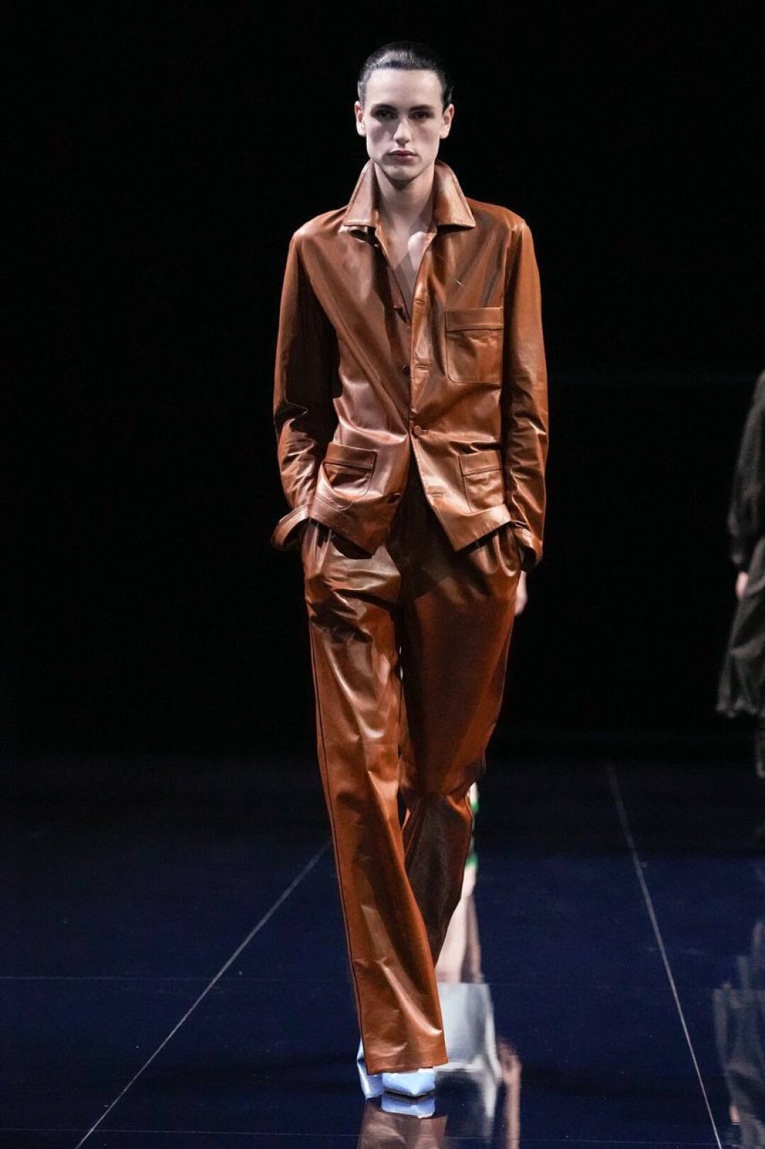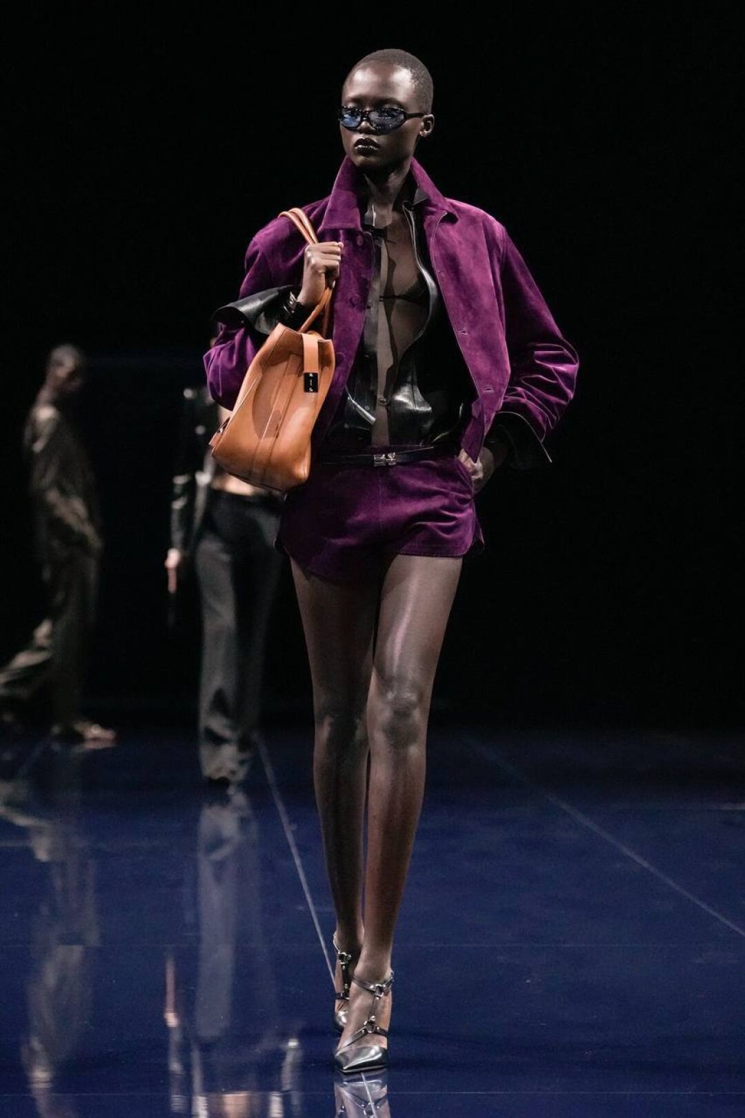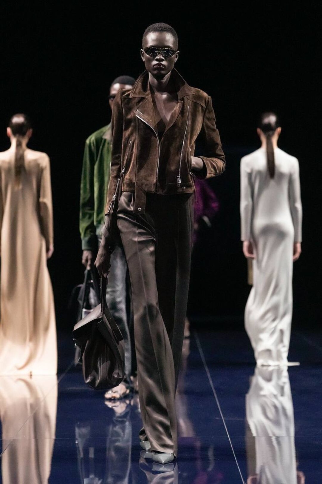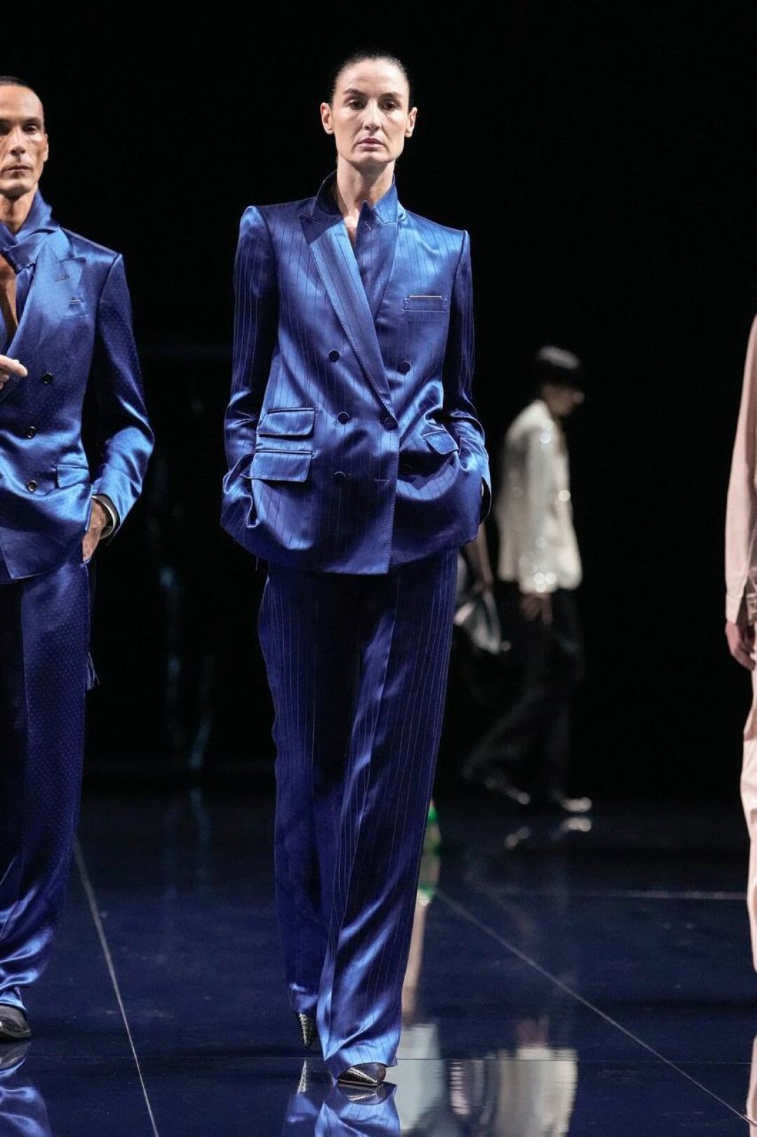 Образы для кинки-вечеринки (с дресс-кодом extremely fashionable!) чередовались с безупречно выполненными костюмами (очень по-фордовски!). Шоу открыла бургунди-двойка с приталенным жакетом и юбкой-карандашом, созданная будто из упаковочной крафт-бумаги с эффектом пчелиных сот. За ней показались белоснежные брюки и жакеты расслабленного кроя, варианты из кобальтового атласа (по мотивам показа забираем для эффектного даблдрессинга!) и карамельной кожи, а еще — приталенные костюмы в неоново-зеленом и пастельно-розовом.