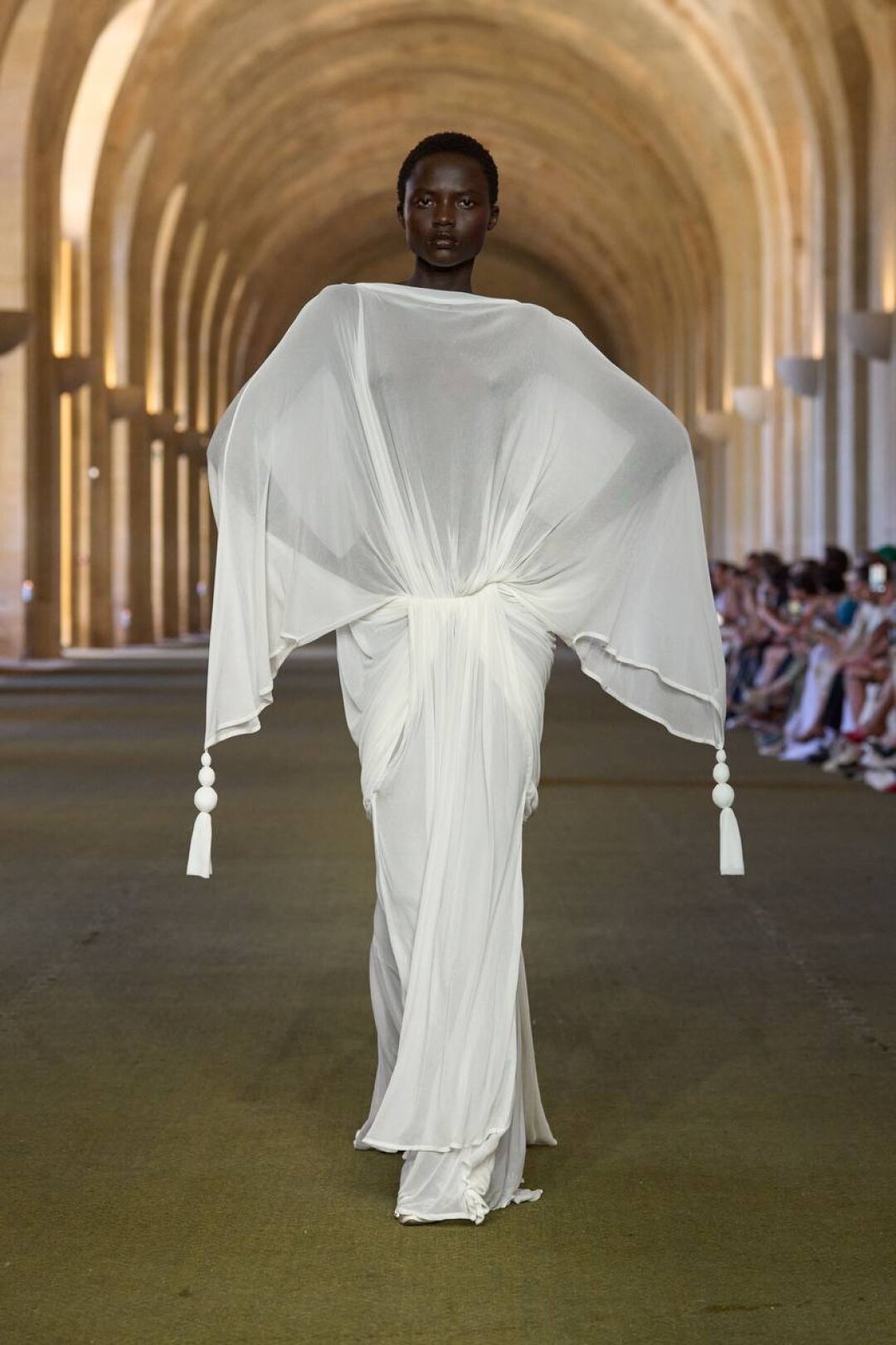 Первая волна драпировок накрыла Париж одновременно с Олимпоманией — накануне летних игр 2024 года и в самый разгар Недели высокой моды — отсюда всевозможные сборки и складки с отсылками к античным статуям на кутюрных показах Jean Paul Gaultier, Christian Dior, Ashi Studio и Schiaparelli. Дальше — больше: превзойдя статус ситуативного микротренда, драпировки стали главным стейтмент-приемом на показах Alaia, Dries Van Noten и Chloe. Раскладываем тренд по полочкам — от хитонов Артемиды до фэшн-скульптур мадам Гре и сюрреалистичных платьев-шарфов Acne Studios.
