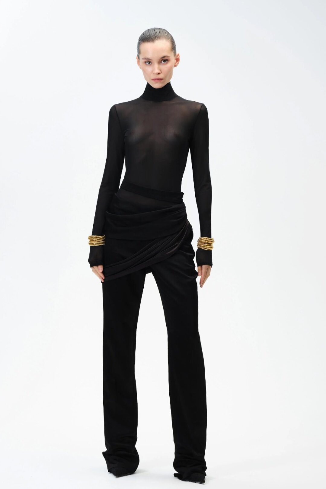 В сезоне FW'25-26 с приемом продолжил экспериментировать Питер Мюлье (как завещал отец-основатель Alaia!), сочиняя из ткани и каркасных стержнях настоящие фэшн-скульптуры. К нему присоединились Жак Вей (в бренде имени себя показал драпированную миди-юбку в тандеме с зебровым поясом-кушаком), Джонни Йоханссон (для Acne Studios сложил мини-платье из тонкого трикотажного шарфа с кисточками) и Джозеф Альтузарра (на подиуме Altuzarra поженил витиевато сложенный топ-платье с меховыми ботфортами и макси-пальто).