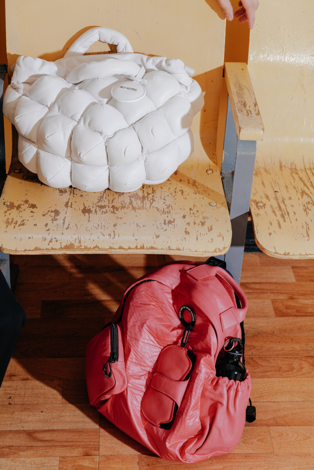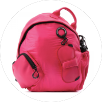 Ярко-розовый рюкзак из натуральной кожи от VIC MATIE’ с накладным карманом на молнии, боковым отделением для бутылки с водой и съемным кожаным чехлом для очков.