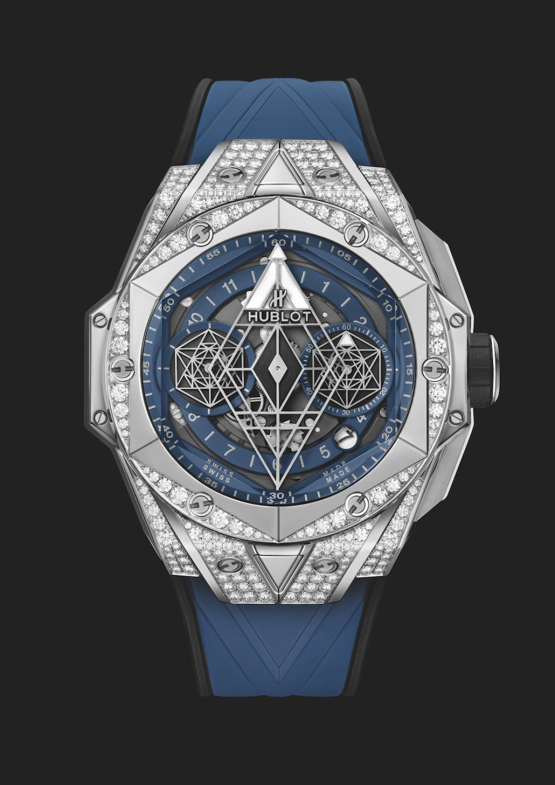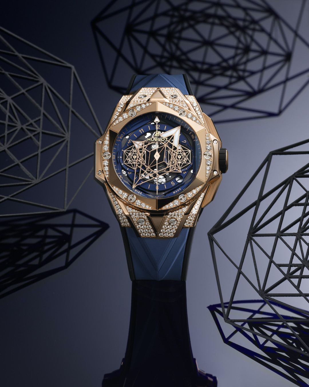 Синий цвет отсылает к чернилам, которые используются в тату-студиях. Этот оттенок появляется на циферблатах и ремешках, выделяя паутину геометрических линий. Корпус часов Big Bang Sang Bleu II диаметром 45 мм доступен в двух версиях: Titanium и фирменном King Gold. Модель оснащена автоматическим хронографом HUB1240, благодаря которому запас хода достигает 72 часов.