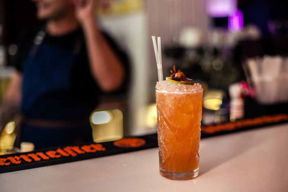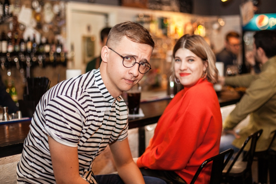 Финал первого дня (к тому моменту нас уже пора было сдавать в какую-нибудь клинику какого-нибудь врача). Сказать, что мы зашли в «Бар с Песнями» – ничего не сказать. Нас занесло внутрь, будто мы ураган, шторм, смерч, в общем, какое-то угрожающее человечеству природное явление. Чуть ли не на входе у нас появилось стойкое ощущение, что вот он – апогей веселья этой ночи. Музыка играет достаточно громко, но при этом собеседника слышно, что говорит о профессионализме звукорежиссера. Подсвеченная барная стойка, сцена в глубине зала, полукруглые столы, достаточно помпезно, но без перегибов. Подходим прямиком к бармену и номинанту нашей премии – Максиму Потапенко. Разговор он завел быстро, подход нашел со скоростью света, и сразу началась магия с коктейлями. Впрочем, чего еще ожидать от человека, который работал в столичном Soho?