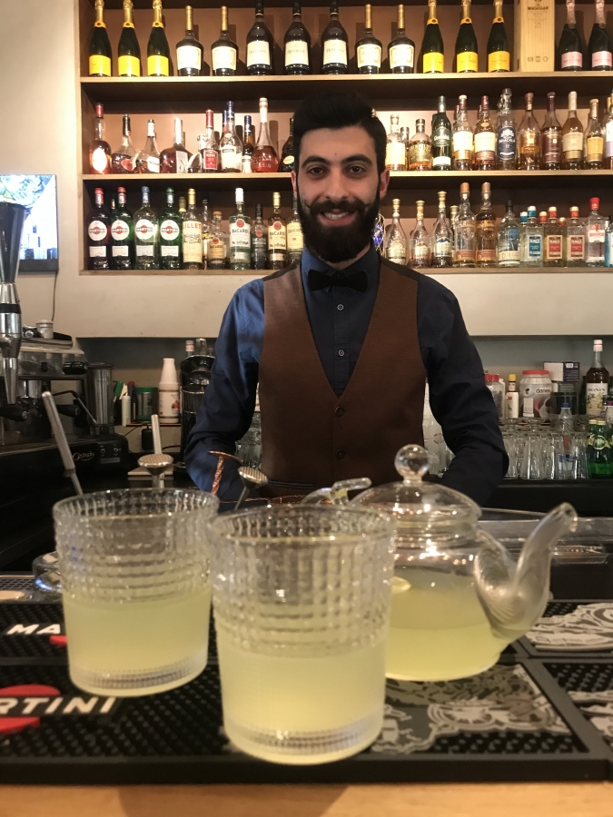 У входа вспомнили, что совершаем паломничество по барам в Хэллоуин. На рецепции нас встретила внушительных размеров старинная египетская мумия, видимо, сбежавшая из национального музея в Каире. Спускаемся вниз, идем сквозь зал к бару, продираясь сквозь суету – заведение в момент нашего визита только готовилось принимать гостей. Территория достаточно просторная и есть чем дышать. Зал очень светлый, а зеленые растения отделяют условные зоны друг от друга. Кому поговорить, посмотреть на других, а кому поближе к танцполу, чтобы во все тяжкие на всю ночь. Мы у бара, за ним человек-паук, вернее, его злой антипод – как оказалось при более близком знакомстве, за его личиной скрывался бармен. Ставит сковородку, горелку, а я уже приготовилась есть. В сковородку кладет нарезанные фрукты, они там томятся, пускают сок, а затем отправляет их в треугольный бокал с алкоголем. Пьешь и словно возвращаешься в свои подростковые годы. Очень девичий и летний вкус. Что пил Влад, я особо не помню, но, вроде, был негрони, которому он пел дифирамбы. -