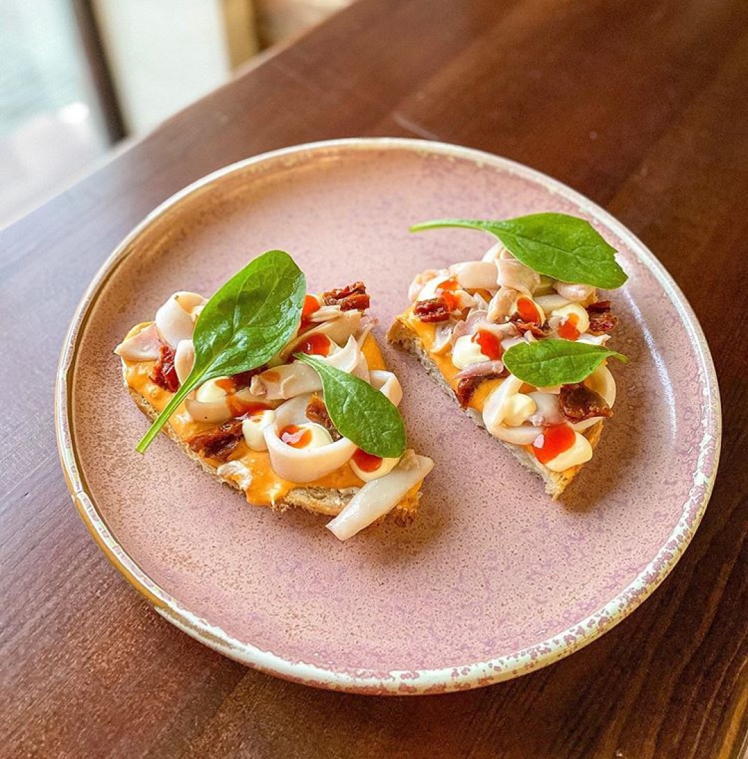 Брускетты в этом заведении – отдельный вид искусства. Только мы успели влюбиться во френч-тост с чеддером и беконом, как шеф-повар знакомит нас с этой новинкой. Просим любить и жаловать: брускетта с кальмаром и ромеско. Официанты «Настроения» рекомендуют не делить ее и делиться.