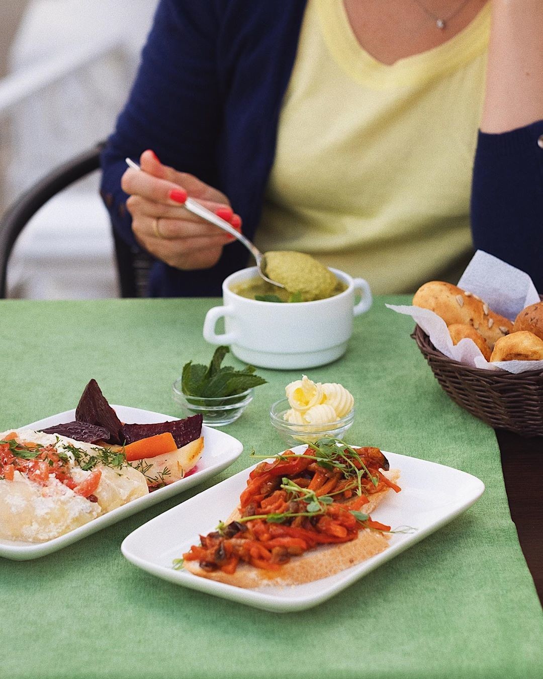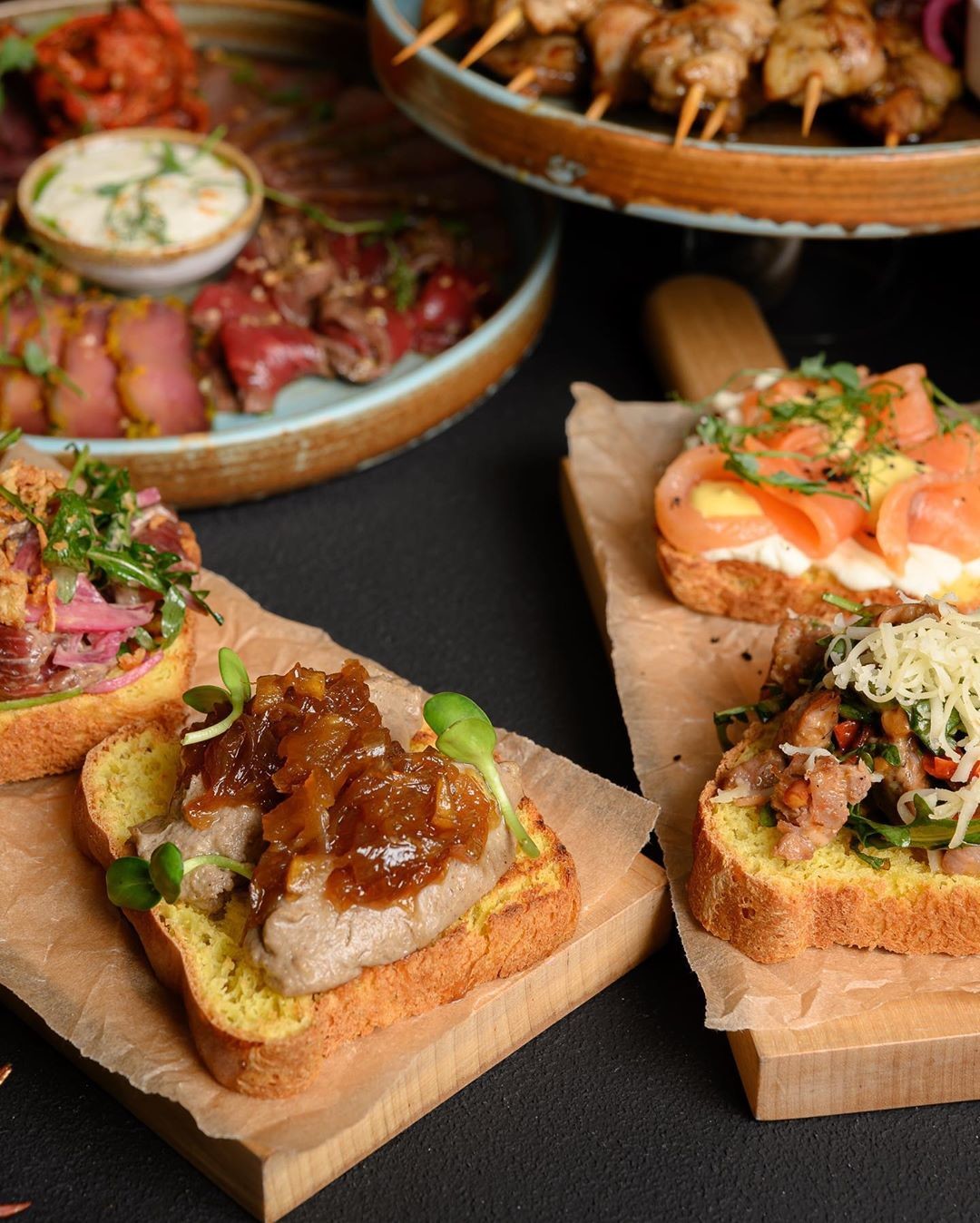 В этом кафе предлагают сразу три брускетты на одной тарелке. Первое ассорти включает тост с хумусом, лососем и соусом песто, запеченным перцем и сыром. Вторая тарелка заслуживает не меньшего внимания: брускетта с сыром моцарелла и томатами, с телятиной, а также с сыром и креветками.