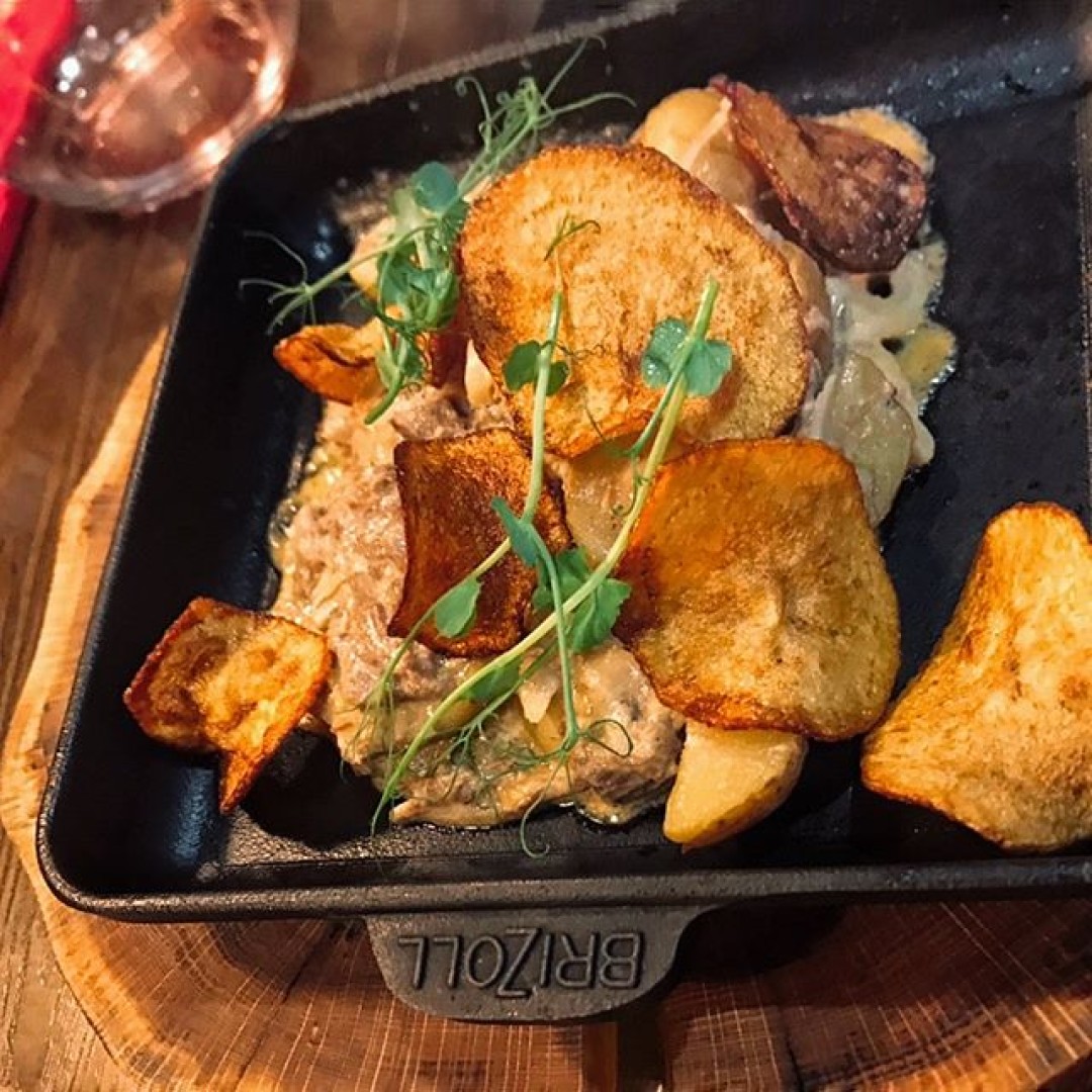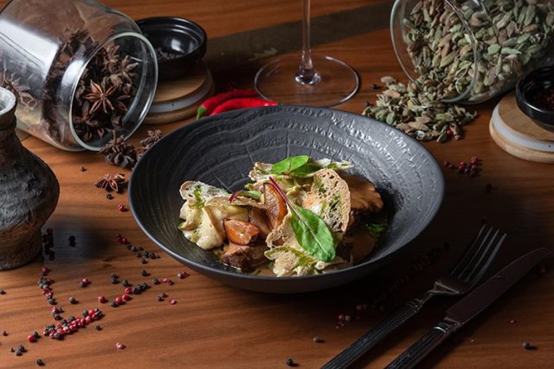 Томленая телятина с вешенками и молодым картофелем в сливочном соусе – новинка заведения и одна из самых калорийных позиций меню. Чувство насыщения приходит практически сразу за счет сочетания мяса и грибов, которые содержат много белка, а также соуса на основе жирных сливок.