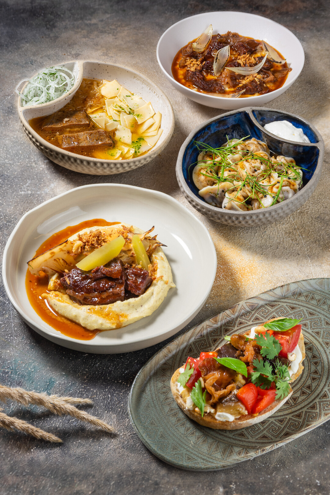 В заведении запустили осенний спешл, и главное – в меню есть и национальные блюда (куда без них в ресторане локальной кухни). Так, здесь подают бишбармак на бульоне из говядины и курицы с томленой говяжьей грудинкой и луком, обжаренным на топленом конском жире. Еще можно заказать пельмени из конины, пасту птитим, брускетту с баклажанами и томленые телячьи щечки в соусе демиглас.