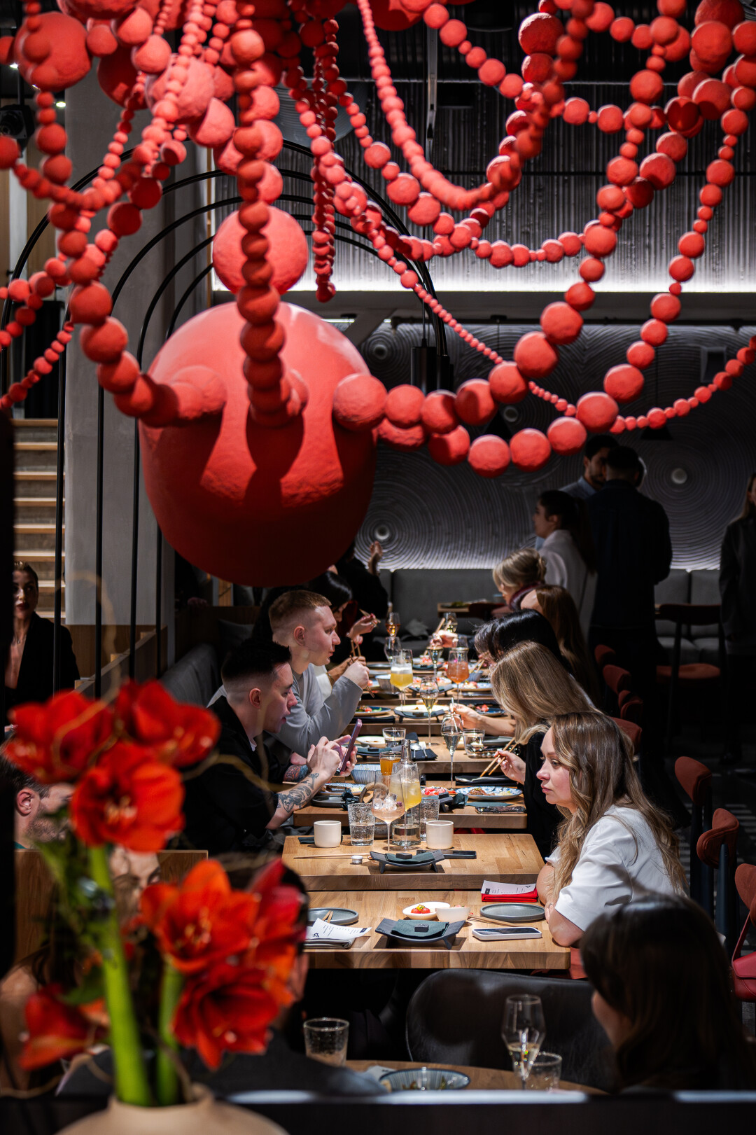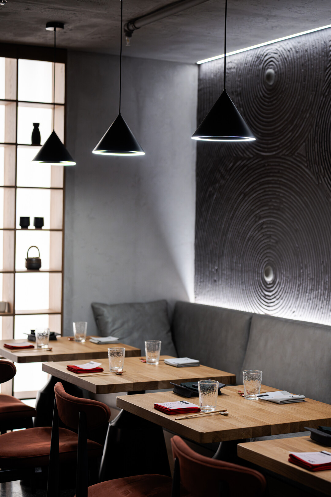В большом зале на 90 мест все наполнено контрастами и гармонизировано теплым приглушенным светом. Главными мотивами интерьера в стиле ваби-саби стали минимализм и спокойные оттенки, соседствующие с яркими акцентами.