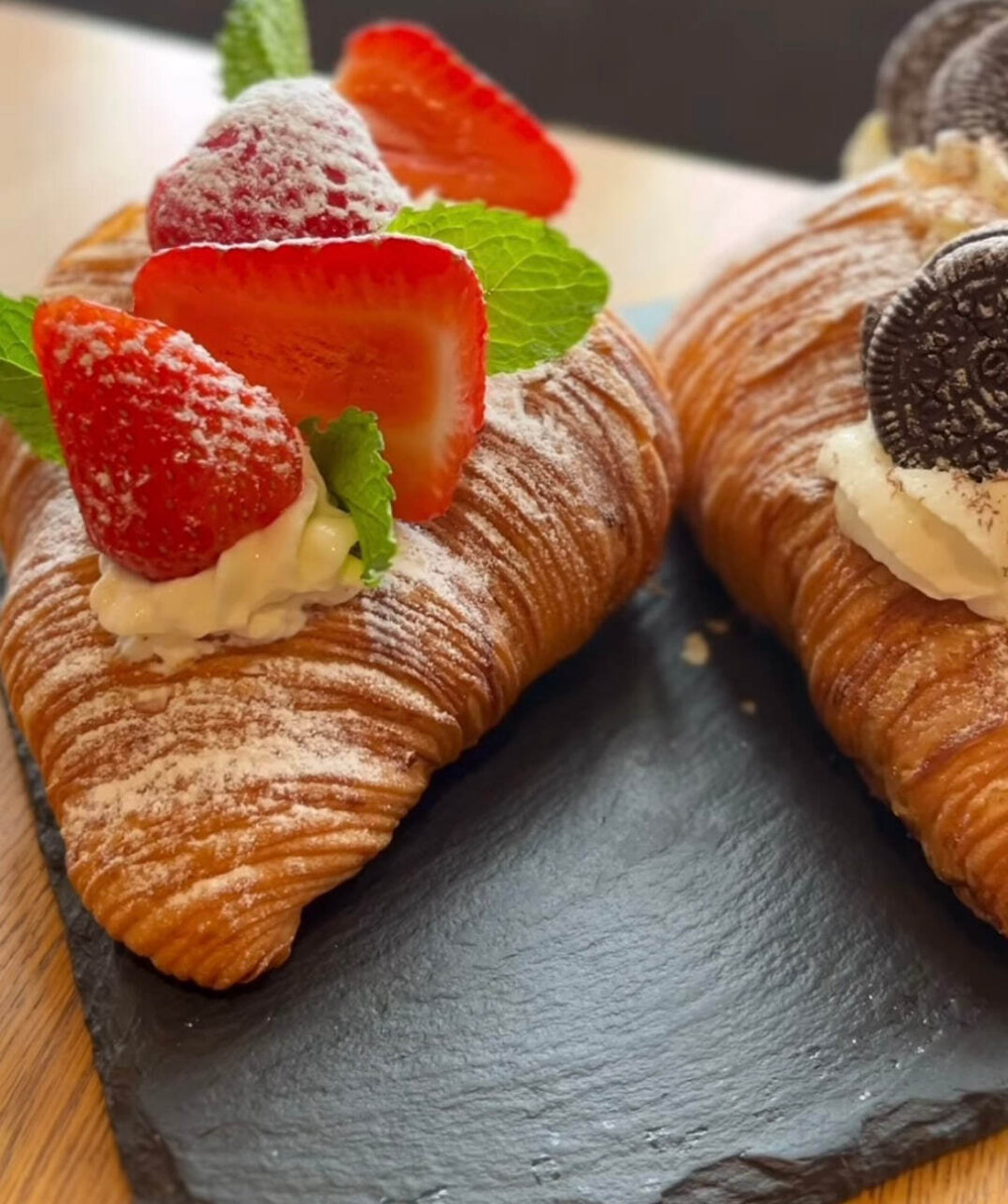 Нежный крем, сочные ягоды (или шоколадное печенье), сахарная пудра – и все это на пышном круассане. Идеально к чашке латте в середине дня.