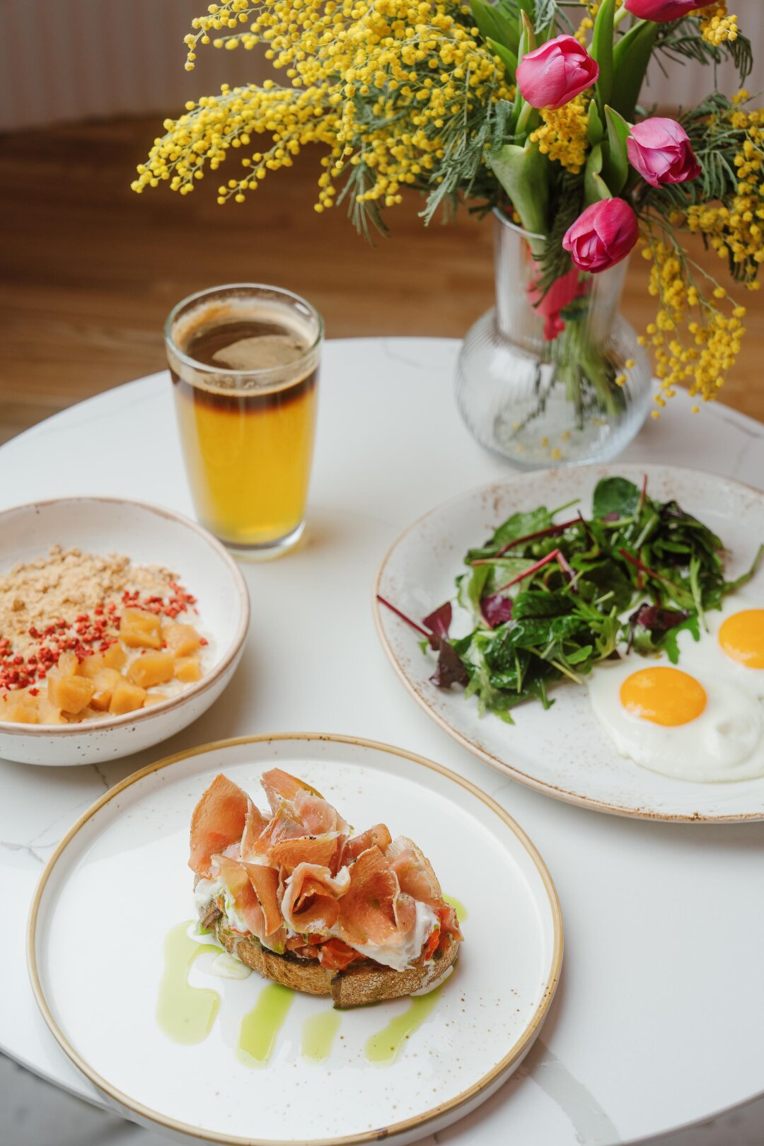 В бистро Salt идем не только за хот-догом с осьминогом – хотя это, безусловно, хит, но и за культовыми завтраками. За них и ваше хорошее настроение с утра отвечают уфимские шефы Линар Тулумгузин и Александр Жуков. Команда рекомендует фирменный сет Salt, если вы предпочитаете что-то традиционное, а мы, в свою очередь, – французский омлет с трюфельным бри, большую яичницу с бутером с лососем и авокадо, картофельный драник с угрем и яйцом пашот. И обязательная маленькая радость: сладкая бриошь, тарт с сезонными ягодами, большой сырник с клубникой или канеле. Каждое утро на фильтре здесь заваривают зерно из Эфиопии, за которым возникает естественное желание возвращаться снова и снова. Кроме красивого завтрака, настроение задают панорамный вид, современный уютный интерьер и дружелюбный сервис.