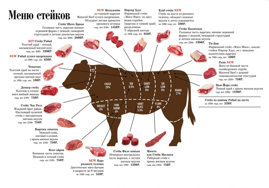 Фанаты стейков смогут подобрать что-нибудь на свой вкус: ти-бон стейк (100 г. сырого веса — 390 руб.), стриплойн (300 г. сырого веса — 1240 руб.), стейк флэт-айрон (250 г. сырого веса — 740 руб.), стейк мясника (250 г. сырого веса — 650 руб.), три-тип (250 г. сырого веса — 650 руб.)