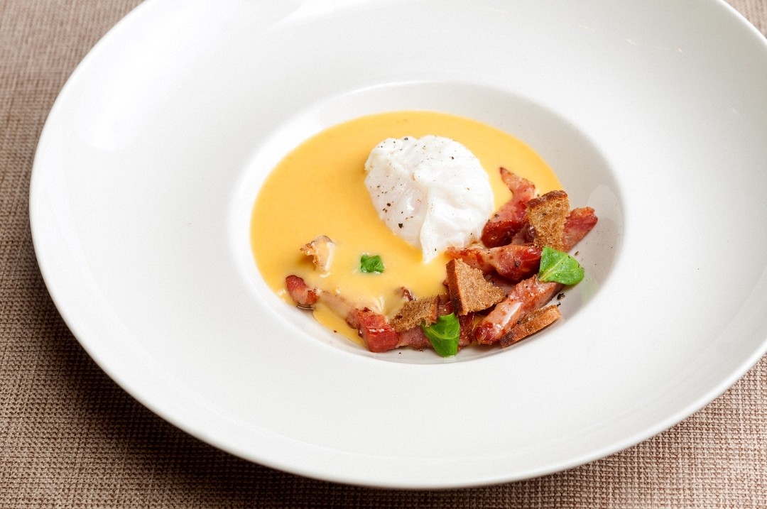Картофельный крем-суп с окороком и яйцом пашот в Loft