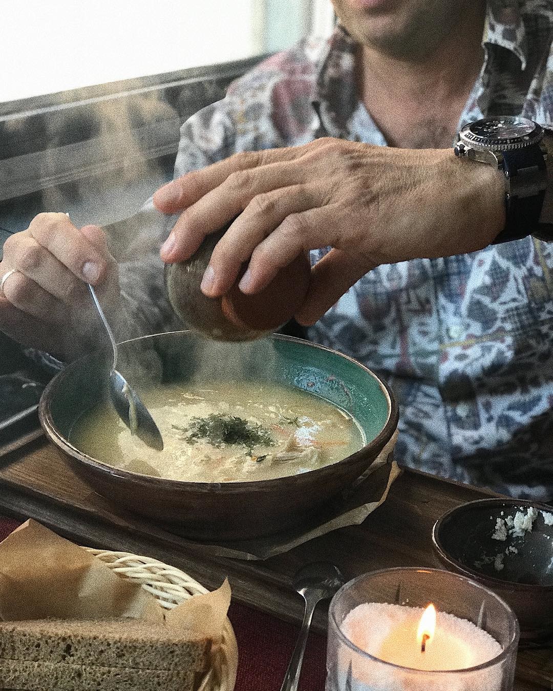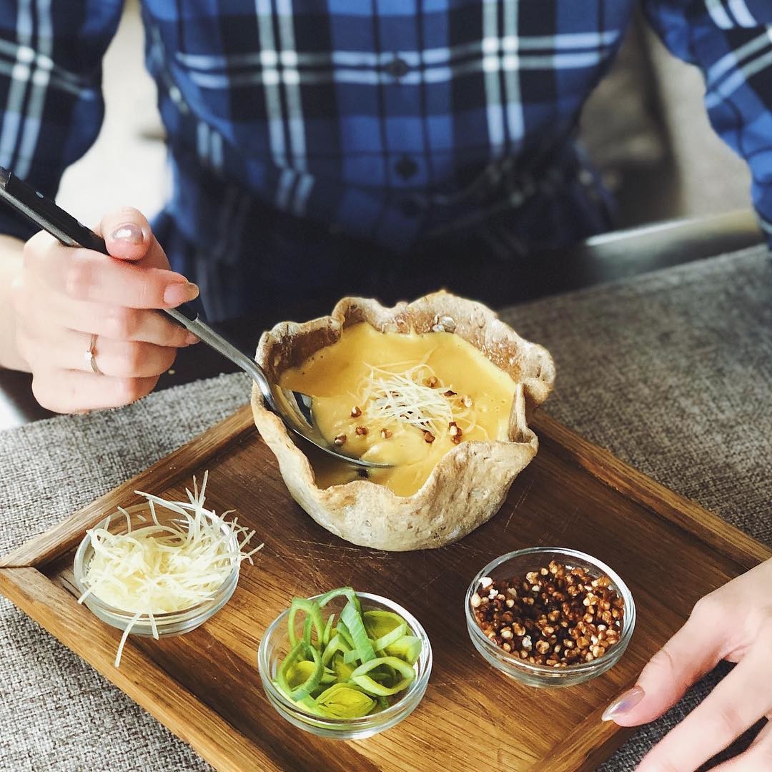 Большой выбор супов в городском кафе «Буржуйка» нас приятно удивил, но больше всего приглянулся именно этот – и все благодаря оригинальной подаче. Его, налитый в твердую хлебную корзинку, выносят на деревянном подносе. По желанию к супу можно добавить пармезан, зеленый лук или попкорн из гречки.
