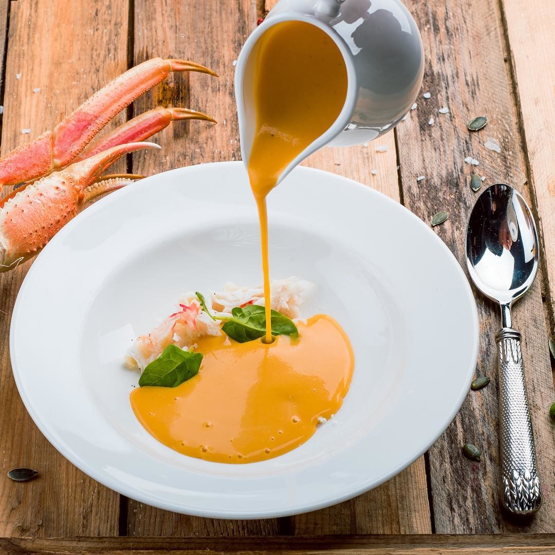 Мы в «Уфа.Собака.ru» знаем, какие рестораны Уфы испытывают любовь к простым, но очень вкусным тыквенным супам. Но никак не ожидали, что в «Вино & Сыр» найдем такое странное сочетание – сладкой тыквы, базилика и соленого крабового мяса. Кстати, супчик здесь подают в кувшине, наливая его в тарелку прямо на глазах у гостей.