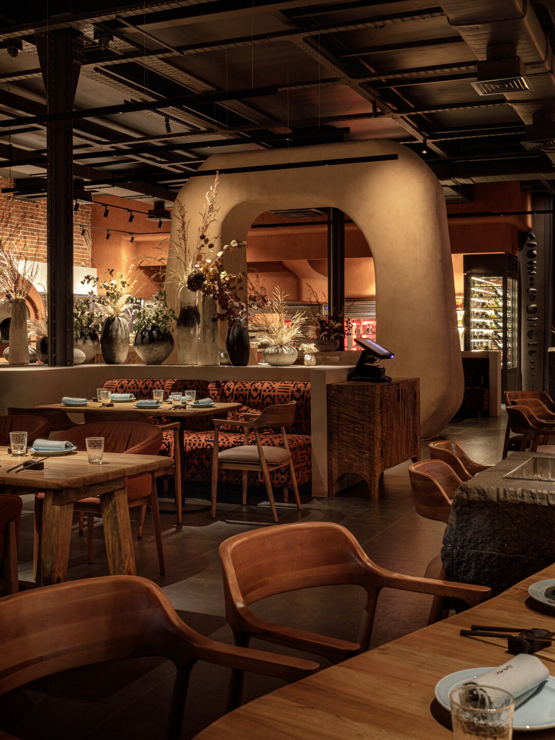 Да, верно. Наша главная задача – чтобы гости собирались компаниями и общались друг с другом за большим столом. Для реализации задумки использовали все, что можно. Во-первых, интерьер. Да, у нас есть множество интересных деталей, которые цепляют глаз, но они не отвлекают от еды и общения. При выборе палитры мы вдохновлялись природными цветами: представьте, вы поднялись на гору, смотрите на перспективу, видите всю красоту – и что вы чувствуете? Вы замедляетесь и успокаиваетесь. При этом мы не действовали в лоб – если первобытная концепция, то это не значит, что всюду шкуры, каменные рубила и драконьи яйца в гнезде. Мы сделали лишь тонкие намеки, через ассоциации второго и третьего порядка. К примеру, в центре ресторана установили инсталляцию, только имитирующую вход в пещеру. Это и важная деталь интерьера, и выгодное зонирование пространства.