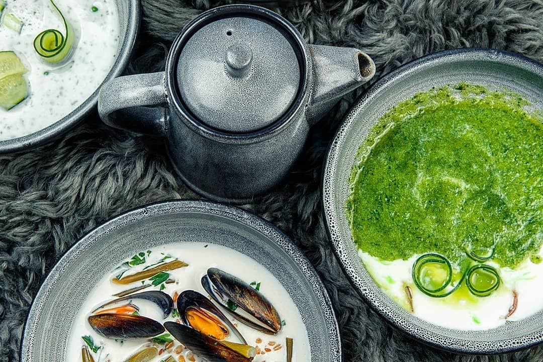 Список блюд такой внушительный, что вряд ли уместится в дайджест, но если тезисно, то для посетителей теперь готовят десять видов сморребродов, салаты с рыбой, морепродуктами и даже клубникой, морские гребешки, голову осетра, тушеные мидии, раков на гриле, тарт с сыром и шпинатом, норвежский крем-суп из пива (да-да!), несколько видов стейков, осьминога, креветок и тунца на гриле, вепрево колено, питтипану, утку с яблочным чатни, митболлы и «ребро всевластия». В меню также добавили блюда национальной кухни: элеш, филе миньон из конины, черные баурсаки с ванильными сливками и кумыс.