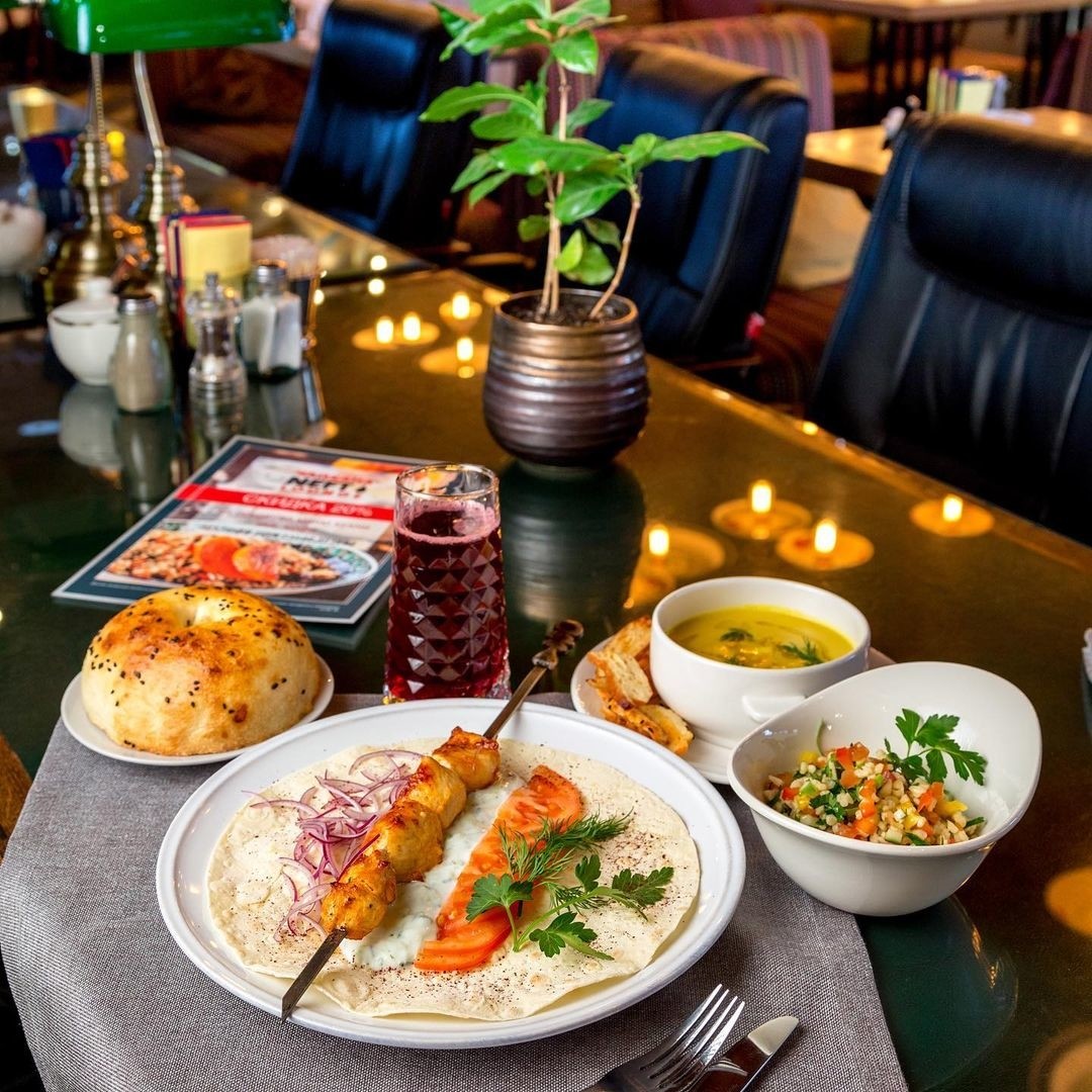 Если обеденный перерыв сильно ограничен по времени, но хочется перекусить сытно и вкусно, вам точно сюда. По будням с 12.00 до 16.00 в заведении действует меню ланчей, а блюда подаются одновременно через 10 минут с момента заказа. В ланч № 1 входят салат из маринованных грибов со свежими овощами, суп с лапшой и курицей, сатэй из курицы с ароматным рисом и арахисовым соусом, компот из сухофруктов и узбекская лепешка. В ланч № 2 включили винегрет, гуляш из говядины с картофельным пюре и зеленым горошком, компот из сухофруктов и узбекскую лепешку.