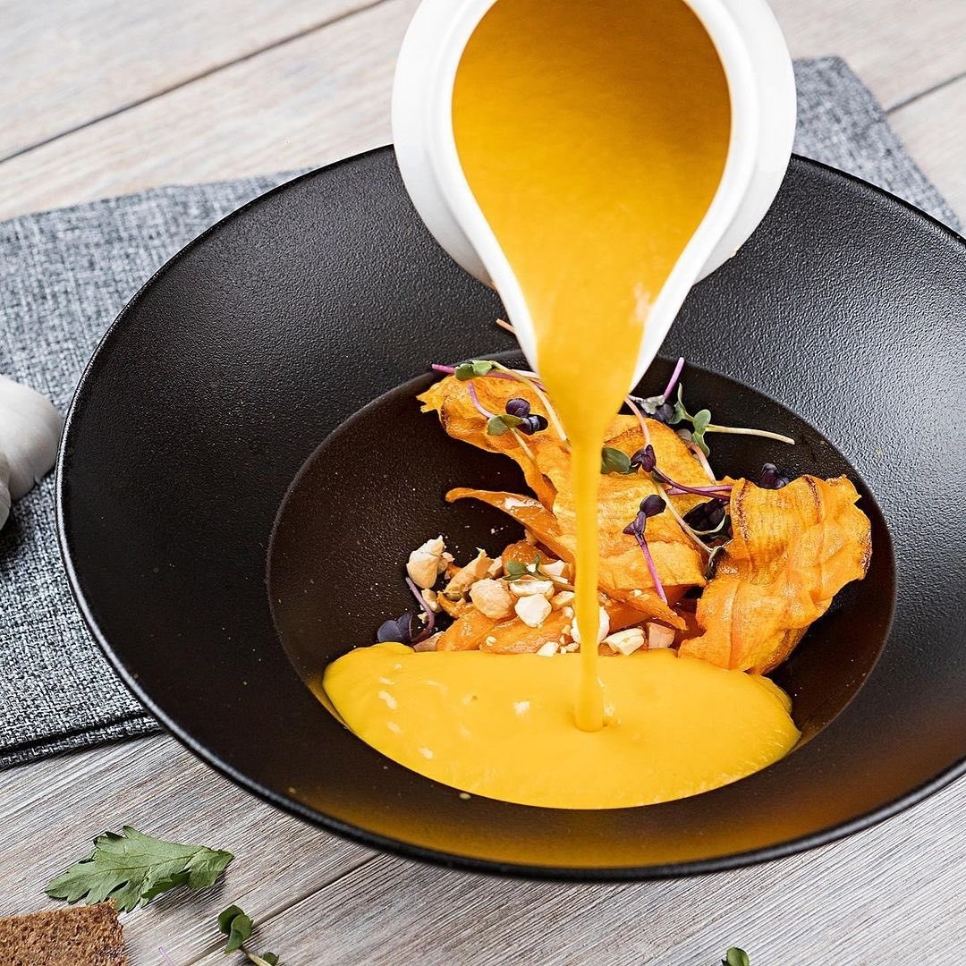 В заведении делают ставку на локальные продукты. Так, из осенних даров – тыквы, грибов и яблок – шеф-повар заведения создал несколько блюд. Приходите пробовать равиоли с тыквой и молодым сыром с муссом из молодого пармезана, сытный суп с подвяленной морковью и кешью, а также перепелку с полбой, белыми грибами и яблочным пюре.