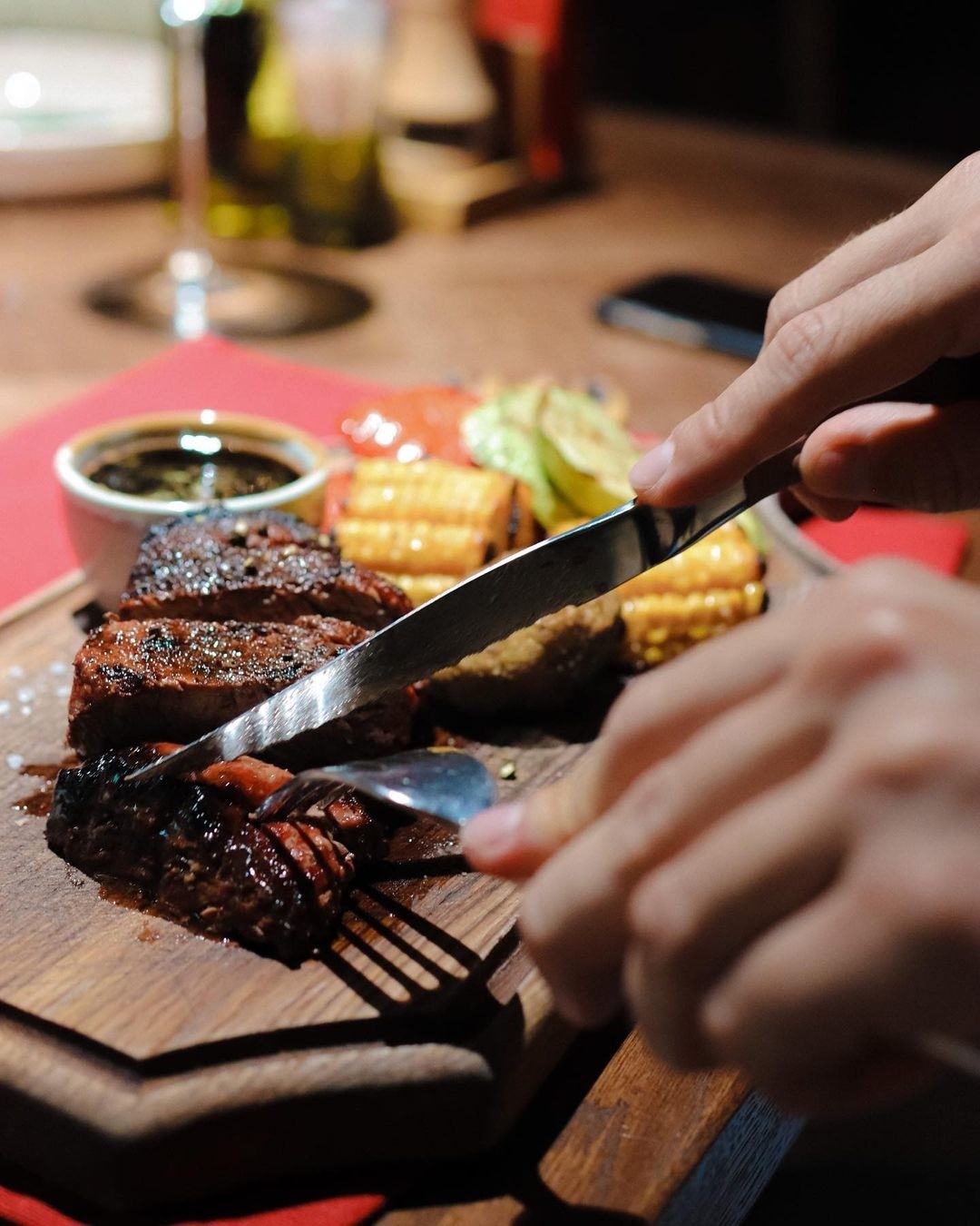 На прошлой неделе нам запомнилась акция для ценителей мяса и вина. Сейчас во время делового обеда в ресторане можно заказать стейки.