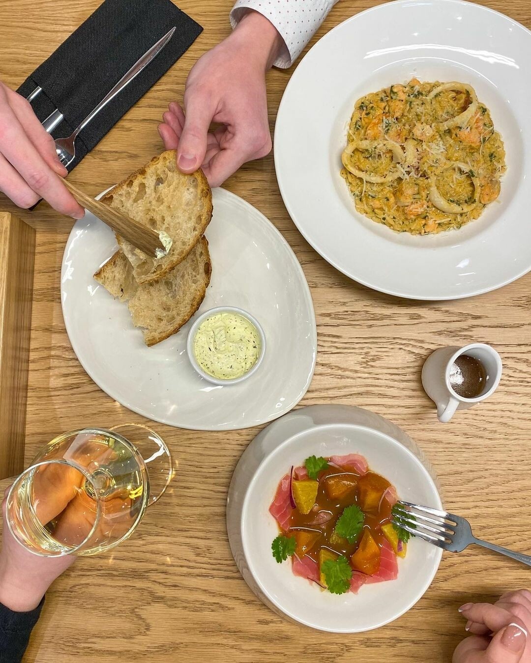 Еще один повод отправиться в кафе на этой неделе: новое меню с итальянским акцентом и появившаяся винная карта так и манят. Крудо из тунца, орзо с морепродуктами и бокальчик белого сухого: звучит как походящий аккомпанемент для первого свидания.