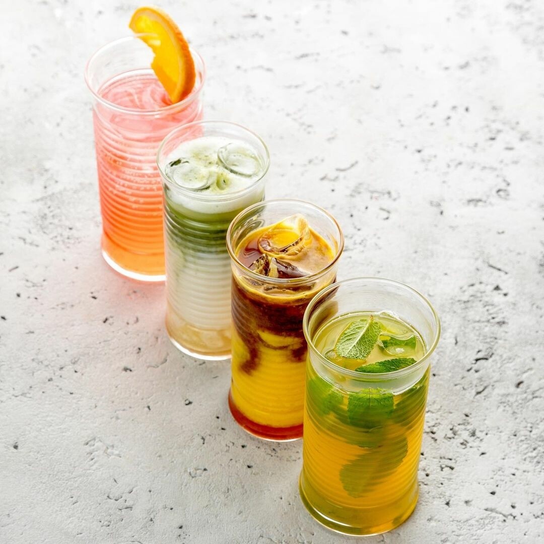 В такую жару сложно думать о еде, а вот напитки заходят на ура. Видимо, руководствуясь этими принципами, Александр Финк запустил целую серию безалкогольных коктейлей и лимонадов. В кадре – айс-ти малина-улун, матча на миндальном молоке, бамбл и лимонад маракуйя-юдзу.