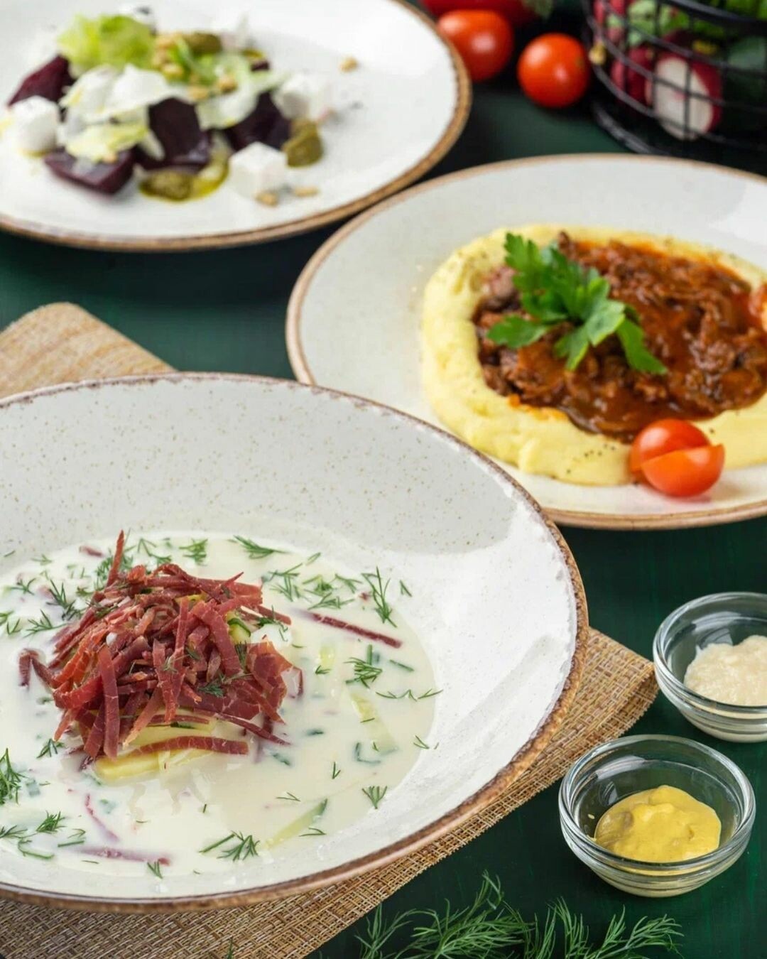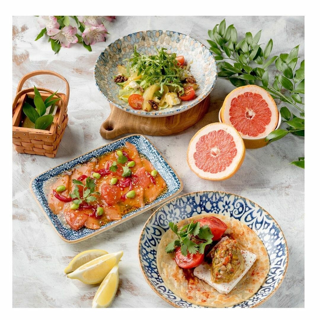 Здесь вас ждет настоящий пир: салат из печеной груши, севиче из лосося, рассольный сыр с овощами, баклажановый хумус, жареные куриные крылышки и слоеный десерт. Именно так в нашем понимании и должен выглядеть правильный обед выходного дня.