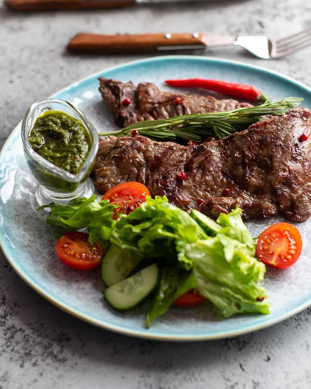 Основное направление заведения на Цюрупы, 78 – стейки и различные блюда из мяса. Но помимо них подают сулугуни в клубничном джеме с вареньем из шишек, мини-чебуреки, студень из говядины, а на закуску – брускетты. Повара экспериментируют с подачей, вынося, например, мясную тарелку на разделочной доске. Большой акцент владельцы гастробара делают на напитках. В стейк-баре также анонсированы бизнес-ланчи по 350 рублей.