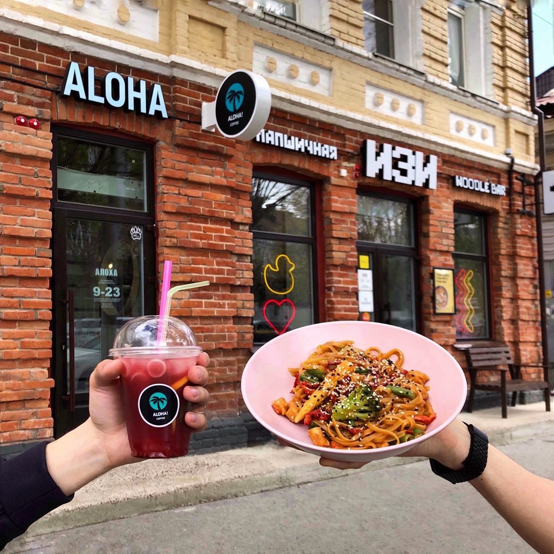 Заведение делит помещение с лапшичной Easy — это значит, что гости могут не только выпить авторские кофейные напитки или кофе альтернативной заварки, но и сьесть китайскую лапшу wok. В меню Aloha есть тосты с нутеллой и джемом, милкшейки и полезные закуски. Интерьер кафе, созданный дизайн-бюро Krokogroup, выполнен в уже привычном гавайском стиле.