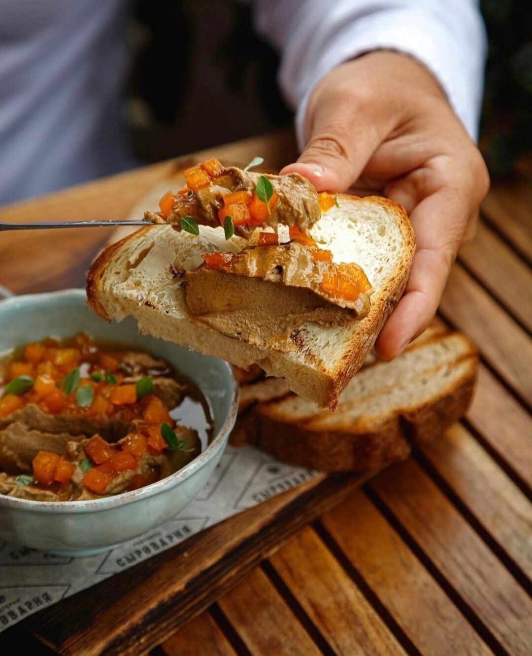 В меню ресторана ввели новую закуску — паштет из куриной печени с тыквенным конфитюром. Блюдо подают с серым и белым хлебом со сливочным маслом.
