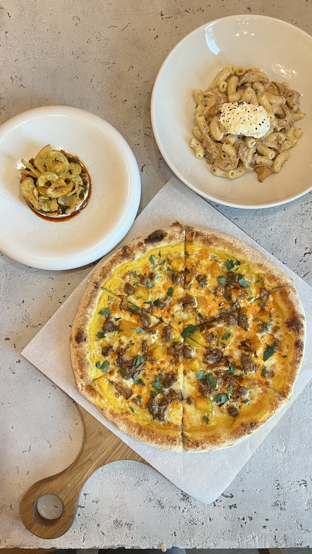 В новом специальном меню ресторана теперь есть тартар из говядины с угрем и азиатской заправкой, пицца с тыквой, осьминог с кремом из картофеля и сельдерея, вареники с уткой и маккерони с лисичками. Еще с четверга по воскресенье здесь можно заранее заказать томленую грудинку с ремуладом из зеленых овощей.
