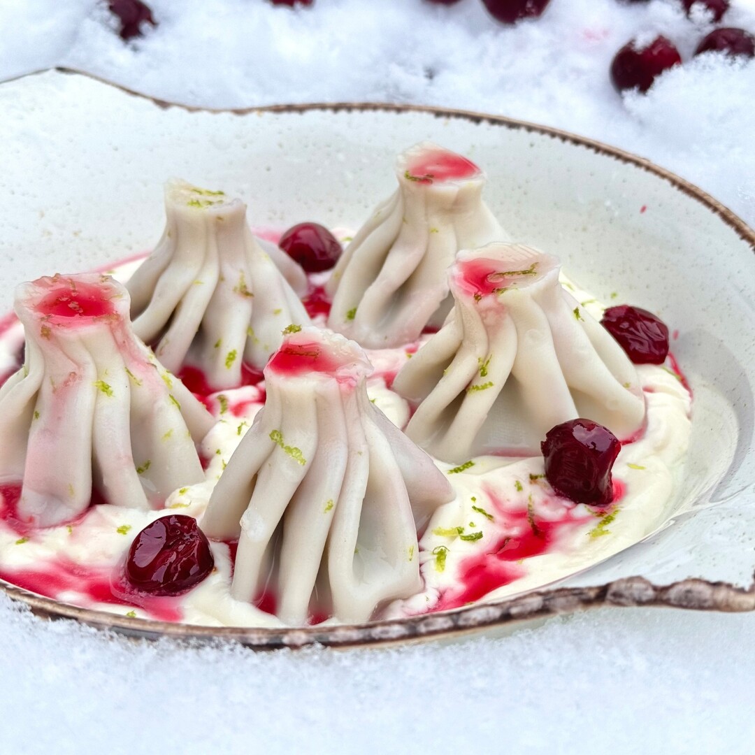 Теперь в ресторане можно заказать специальное блюдо – хинкали с вишней. Их подают в сладком соусе с сиропом. Стоимость: 290 рублей.