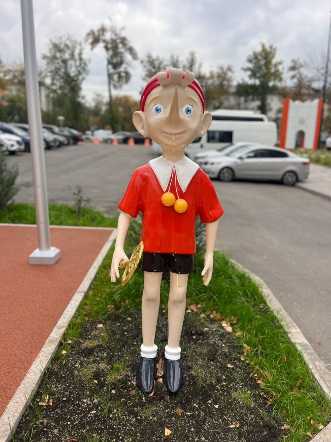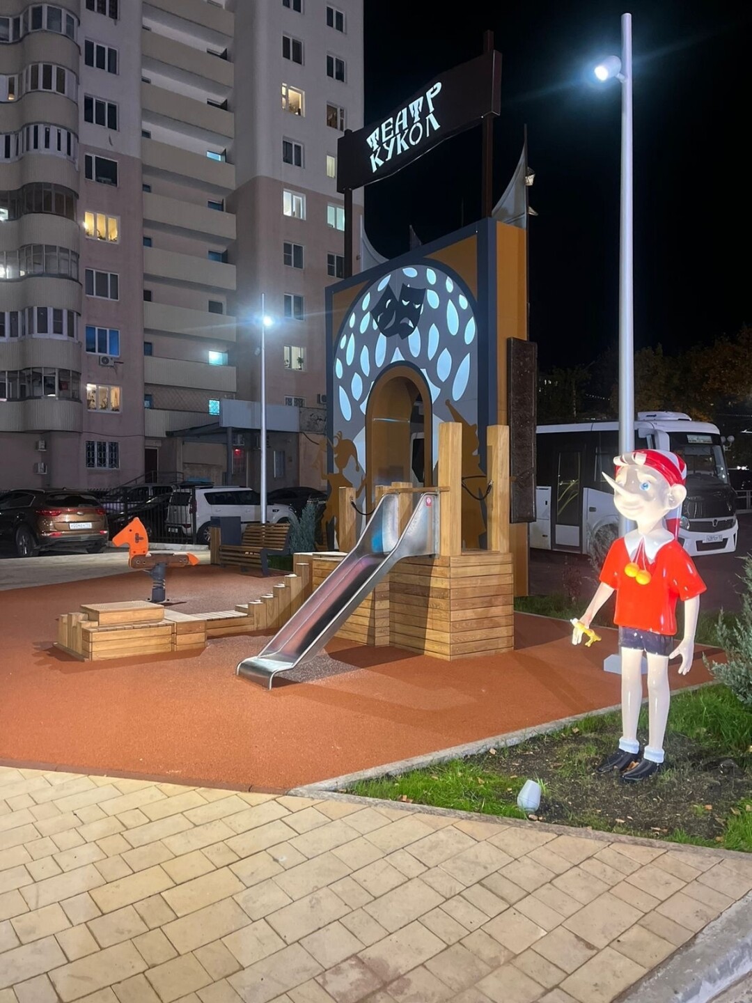 Площадку оформили по сюжету известной сказки Алексея Толстого "Золотой ключик". Среди элементов – фигуры персонажей, игровое оборудование, в том числе интерактивное.