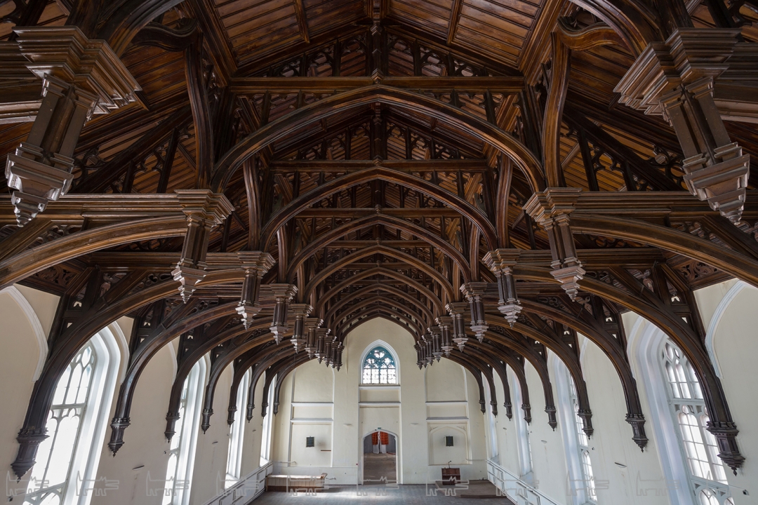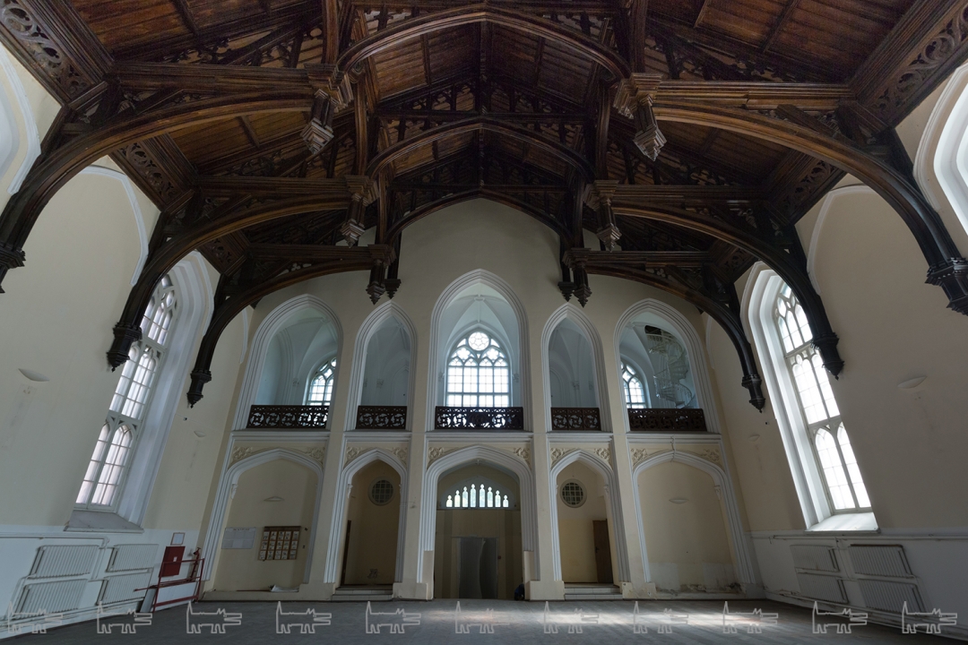 Конюшни в неоготическом стиле были возведены Николаем Бенуа по личному заказу императора Николая I за семь лет: с 1848 по 1855 год. Сердцем комплекса стало здание манежа, где происходила объездка лошадей и демонстрация их главе государства. Главным его украшением служит деревянный потолок, созданный по подобию средневекового английского «Hammer-beam» – крыши с открытой деревянной стропильной системой и декорированными сложной резьбой фермами со свисающими шишечками.