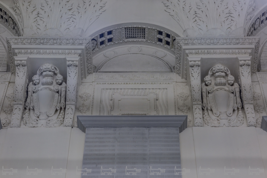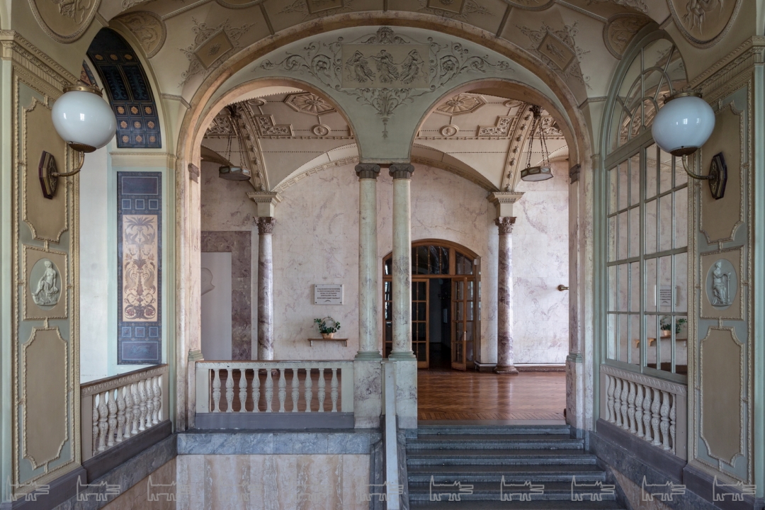 Во внешнем и внутреннем облике здания архитекторы отдали предпочтение итальянскому ренессансу. Аванзал и две парадные лестницы полностью отделаны искусственным мрамором, по сей день сохранившим блеск. Парадное фойе с зеркалами украшают гротески и медальоны с зодиакальными символами.