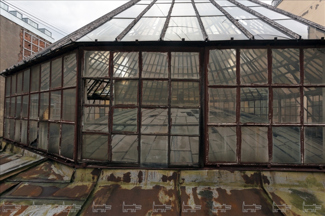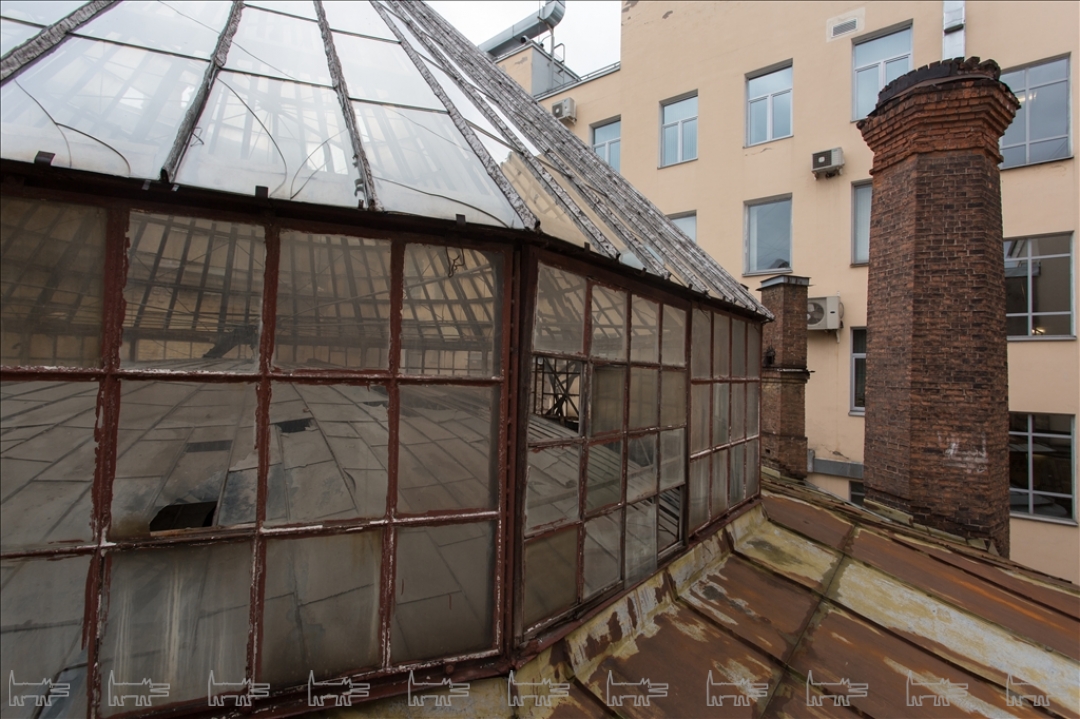 Здание на Большой Морской было перестроено архитектором Виктором Шретером в 1887-1888 годах специально для Русского для внешней торговли банка. Он облицевал фасад вюртембергским песчаником, а операционный зал впервые в России решил создать с использованием новаторских для того времени инженерных конструкций: двухуровневый и круглый по форме, он перекрыт стеклянным куполом с витражными секциями, фермы которого опираются на металлические колонны.