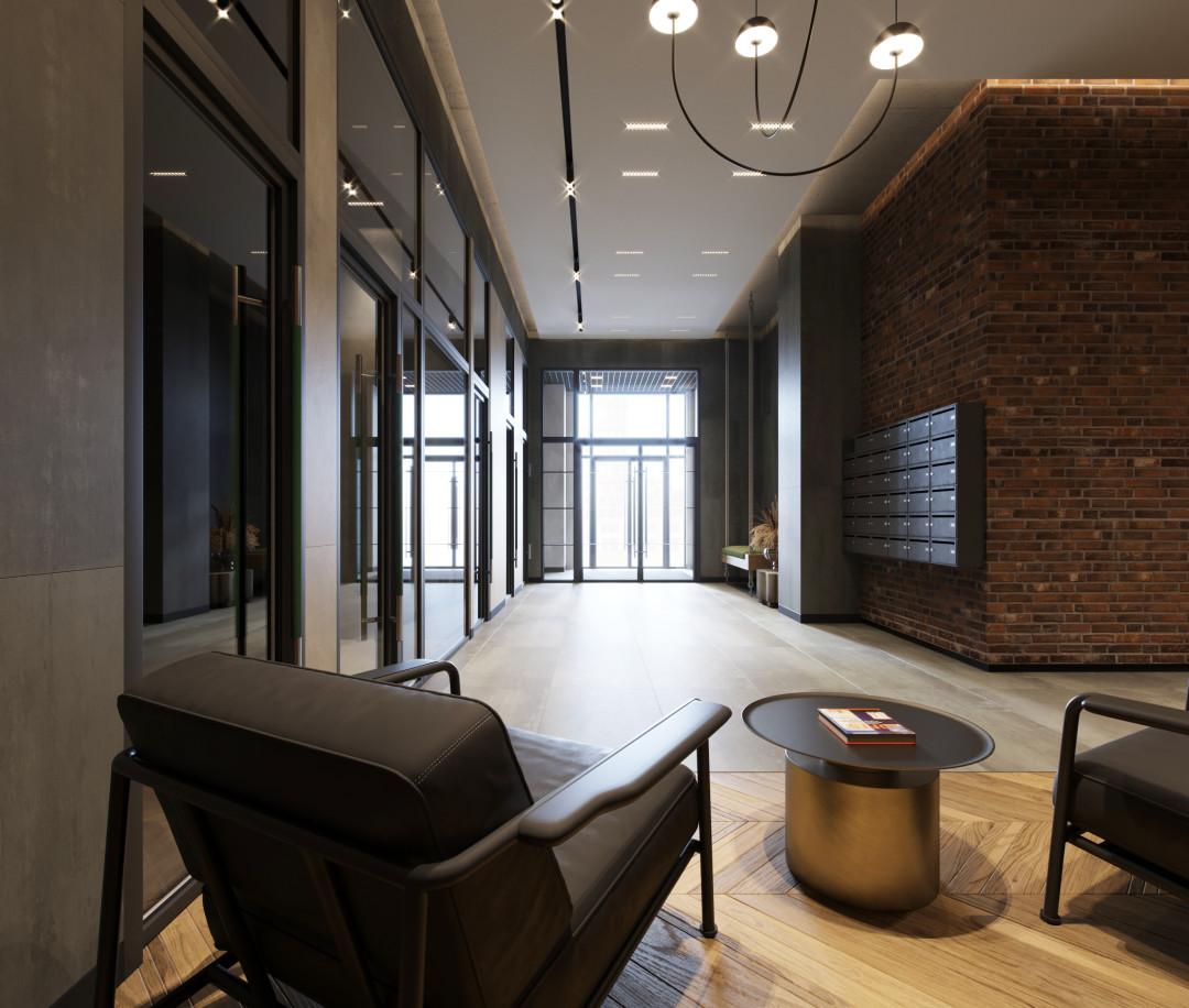 Лобби в жилом проекте – это пространство, которое соединяет город с квартирой, и важно сделать этот переход плавным. Поэтому почерк архитектора, создающего концепцию фасада, виден и внутри дома: холлы выполнены в стиле лофт. Брутальные стены, согласно проекту, выполняются из кирпича и штукатурки с фактурой бетона и камня. В этом заложена основа индустриального стиля, который подчеркивается дизайнером с помощью акцентных деталей: навигационной ленты, дверных ручек и флористики. Особую атмосферу «Конди Лофта» дополнит авторская мебель: кожаные кресла в урбанистическом стиле, скамья-качель из дерева с мягкой обивкой, тумба-постамент.