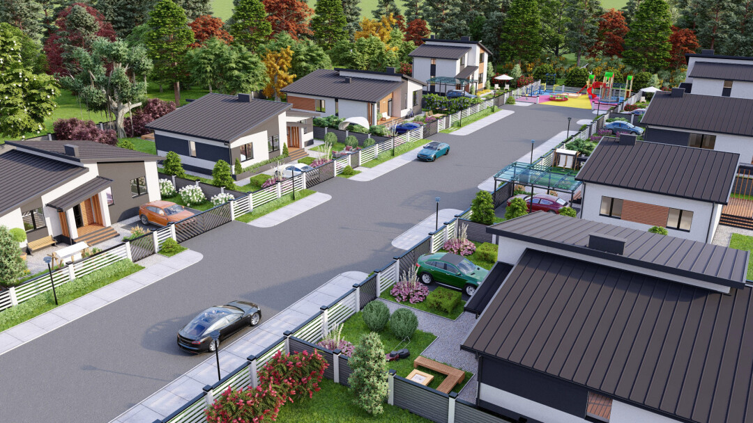 Новый поселок от ГК «Висма» – воплощение футуристического минимализма и простоты геометрических фигур. К услугам жильцов – все удобства: закрытая территория, своя детская площадка, освещение, видеонаблюдение. У каждого дома есть индивидуальный забор и собственное парковочное место.