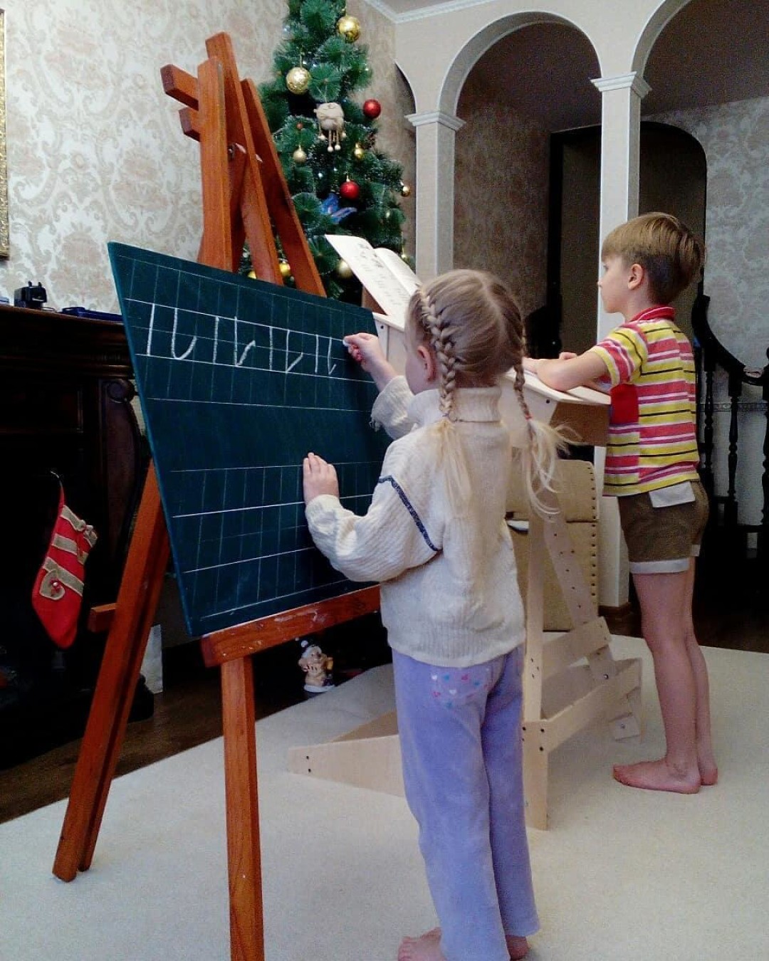Мартина и Оливию мы начали учить, как только у них появился интерес. Интересна ребенку в пять лет математика? Тогда начинаем заниматься в пять. Только методы у нас не школьные – в основном используем разработки Николая Зайцева, советского и российского педагога-новатора. В нашей группе в «ВК» «Игры–Репетиторы» жена выкладывает много роликов и своих статей по дошкольному и школьному образованию, в том числе по методикам Зайцева и собственным разработкам. Часто наши дети во время занятий не сидят, а бегают и прыгают. Занимаемся, как правило, до первой усталости. Но так как Мартин, например, иногда считает миллионами, стоя на голове, он свободно выдерживает часовой урок без перерыва. Сейчас занимается полтора-два часа в день русским языком и математикой. Мы не ставим детям оценки – они сами учатся оценивать себя, например ищут наиболее красиво написанную букву. Дети критически относятся к самим себе, а не смотрят на других.