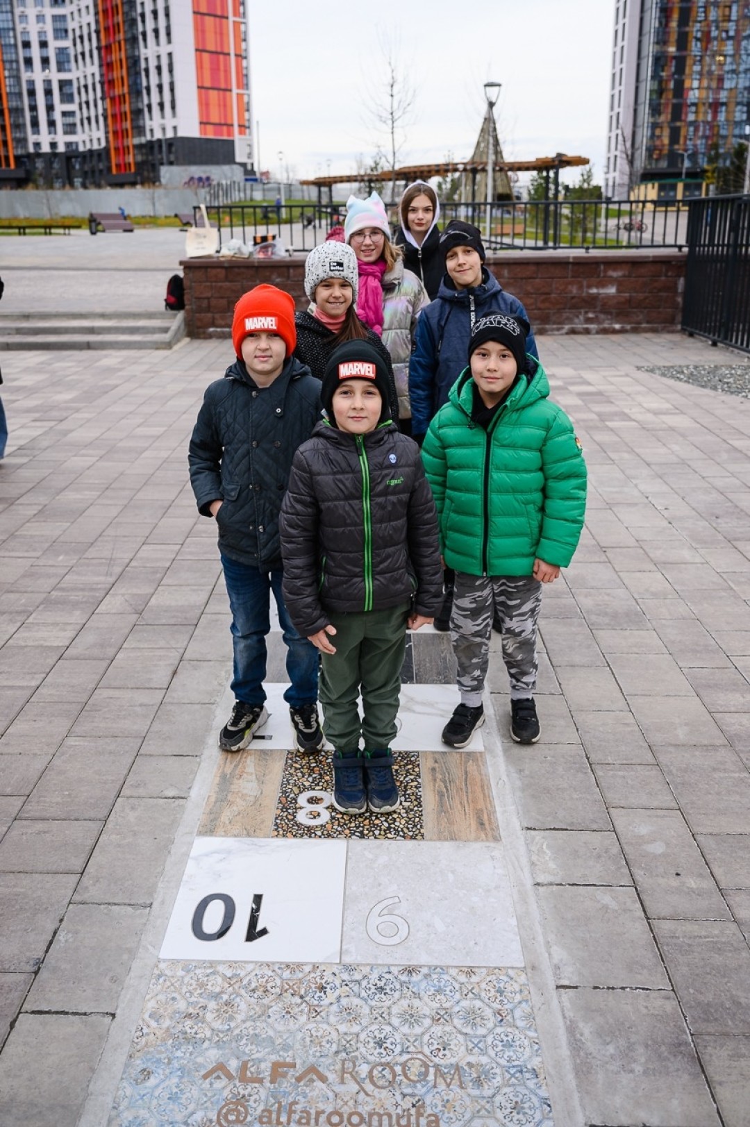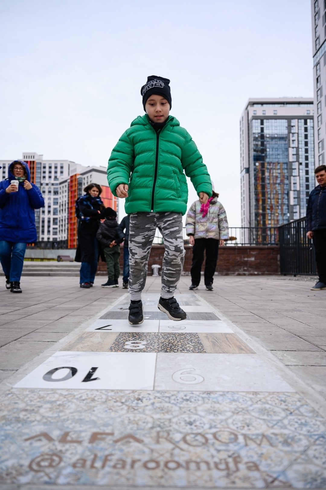 Разделенная на квадраты фигура, по которой советские дети прыгали на перемене и после школы, появилась в «Квартале Энтузиастов». Компания «АльфаRoom» решила возродить детскую игру, вместо того, чтобы обсуждать новости из соцсетей, поколению «Альфа», зумерам и бумерам , а также их родителям предлагает весело прыгать по квадратикам.