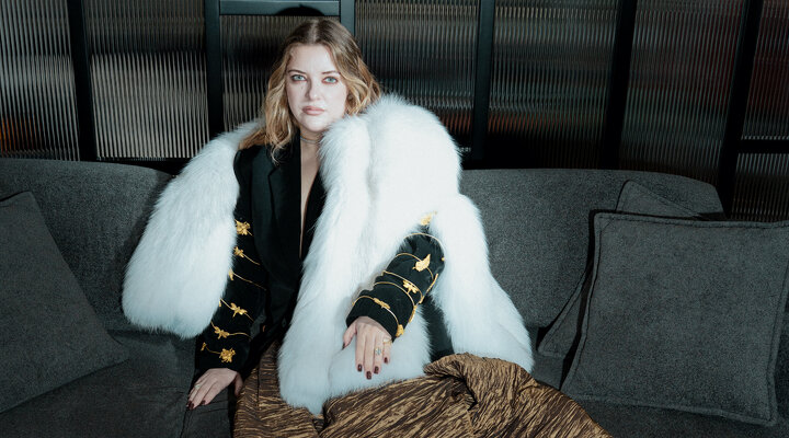 На Татьяне: юбка и пиджак ДАРИНА БОЙКО, кейп SENCELLERIE, серьги BOHEME, кольца и чокеры HERALD PERCY (все — Poison Drop).