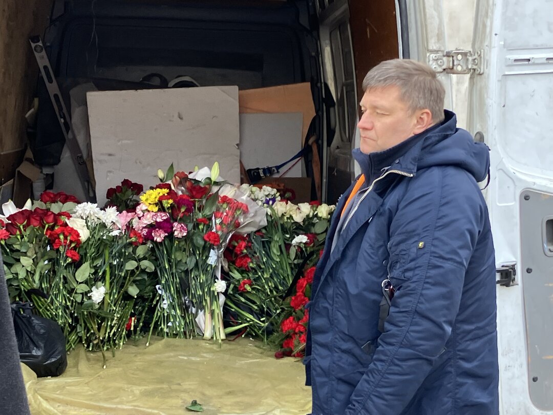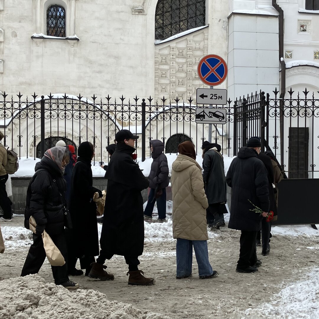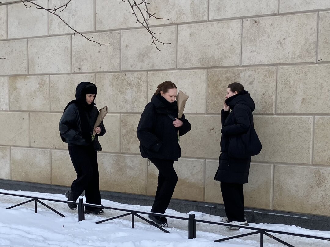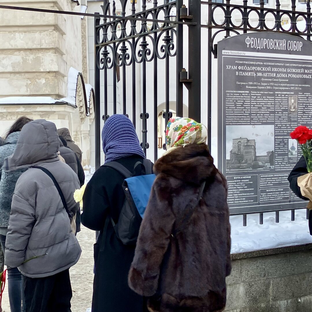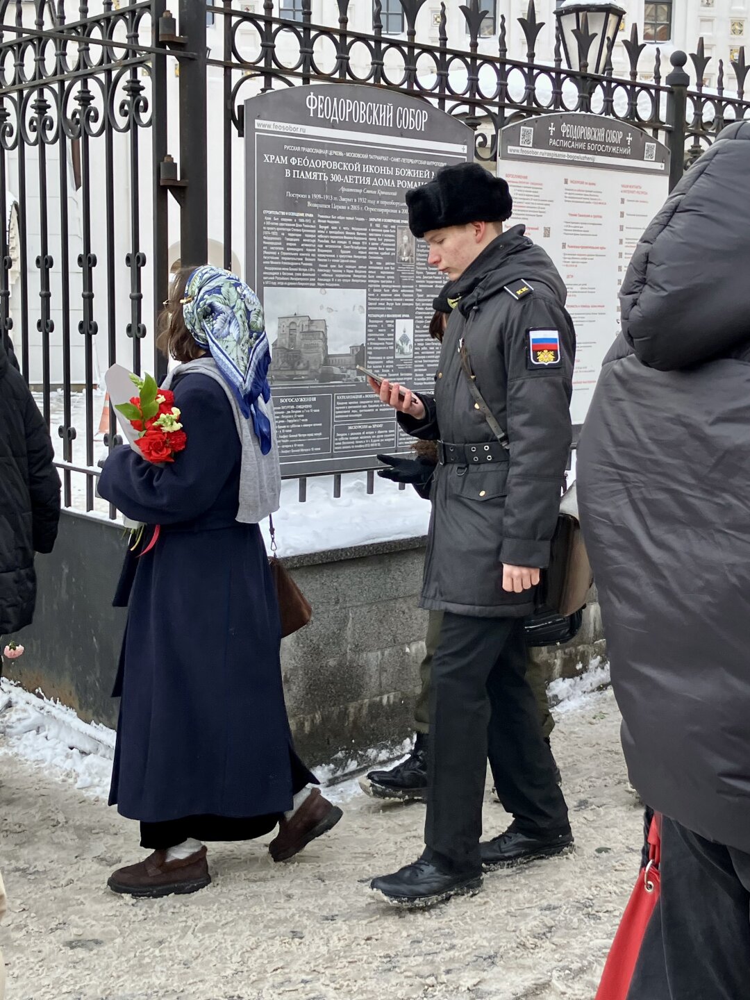 Мимо бесконечно несут цветы: в 10:59 очередь в Феодоровский собор уже достигает вывески «36,6» на доме №2 Полтавском проезде, а к 11:37 тянется далеко за угол. Проводить Николая Комягина собираются цветноволосые нефоры-зумеры и нормкорные миллениалы, дошкольники-близняшки в одинаковых куртках, курсанты в форме. Когда идешь вдоль очереди к концу, люди пристально смотрят тебе в глаза — говорят, сам Комягин часто так делал, когда поклонники встречали его на улицах Петербурга.