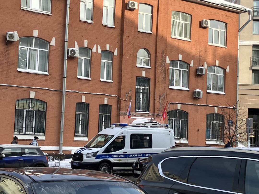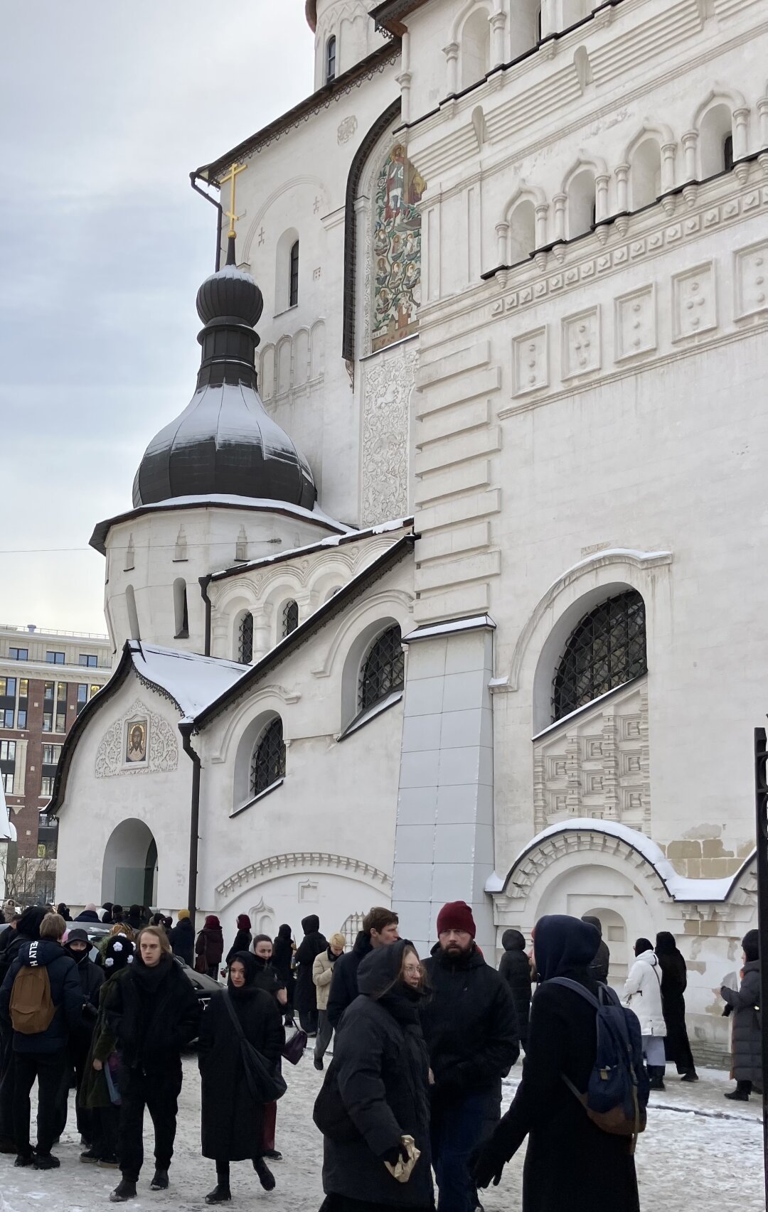 Феодоровский собор, выбранный для отпевания Комягина, заложили в 1904 году. К колокольне храма примыкает стена, напоминающая кремлевскую, — она символизирует единение Москвы и Петербурга. «Над собором Кремля-я-я...» — ветер, кстати, не поднимается. Погода утром 24 февраля стоит ясная, хотя ждать на улице немного холодно.