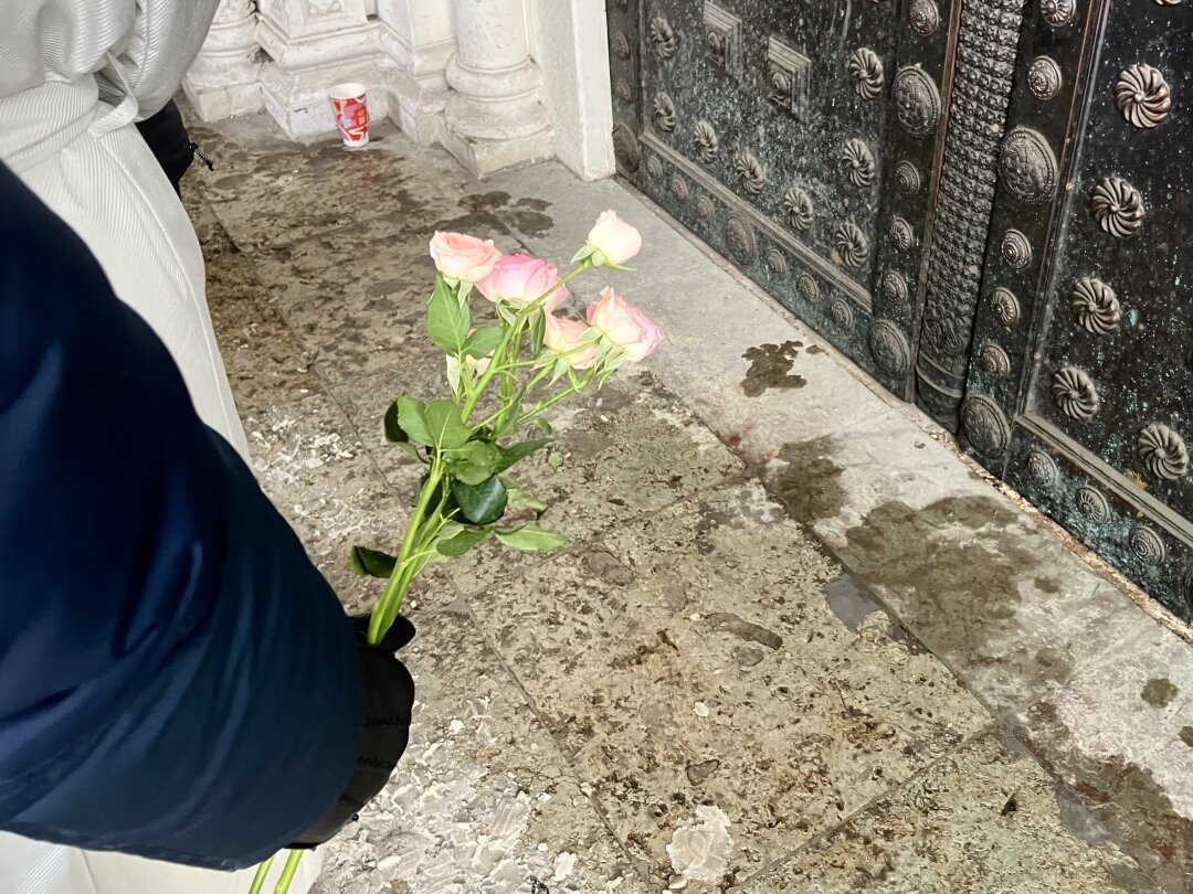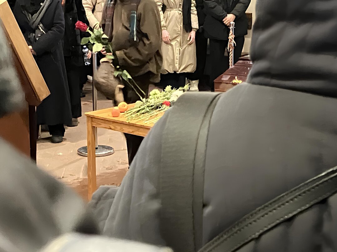 Многие изначально пришли с цветами, но к флористам в магазине по соседству тоже выстраивается мини-очередь. Пока колонна движется в храм, провожающие ходят за кофе, ищут друг друга в толпе и тревожно курят. Закуривает и полицейский — на этом участие правоохранительных органов в прощании закончится, хотя за первой машиной прибудет и вторая.
