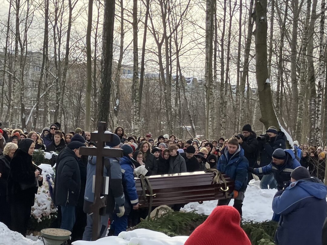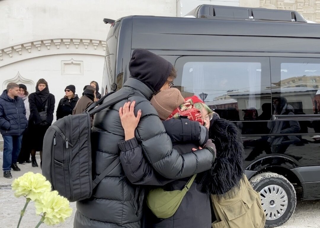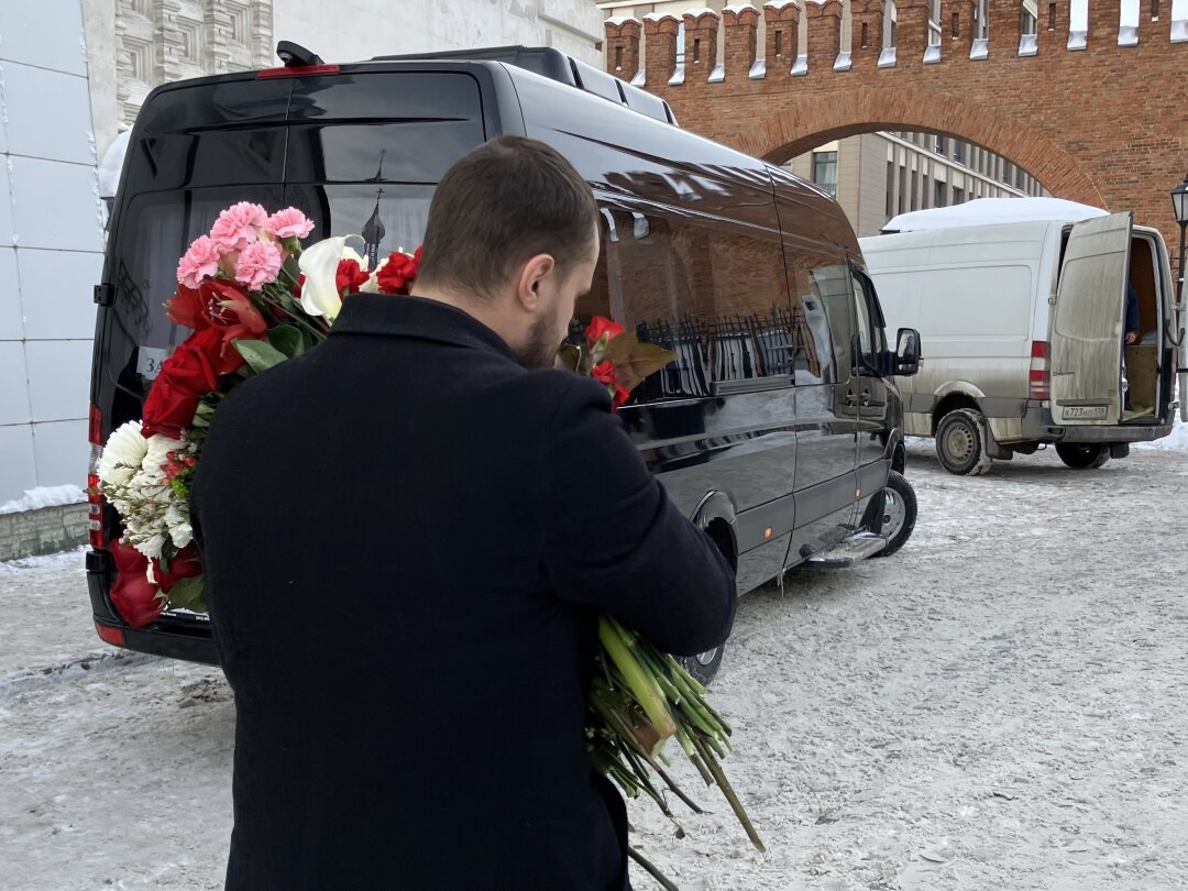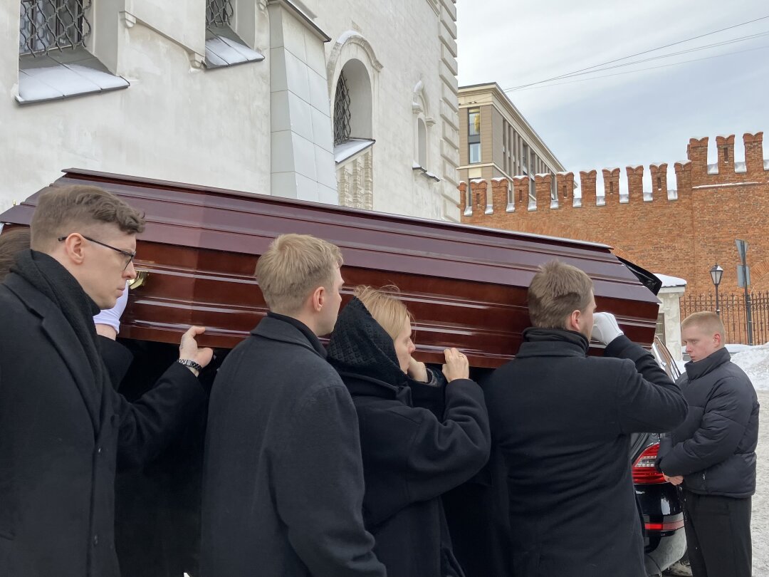 В начале первого к Феодоровскому собору подъезжает катафалк. В 12:36 близкие выносят гроб. Катафалк провожают аплодисментами. Следом на газели увозят охапки цветов.